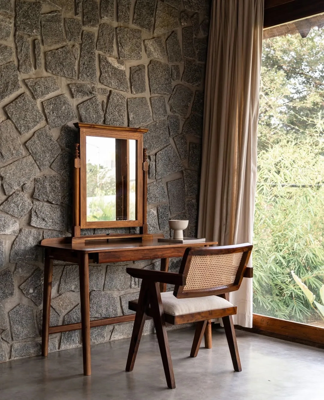 Penteadeira de madeira simples com cadeira e encosto de palha indiana.