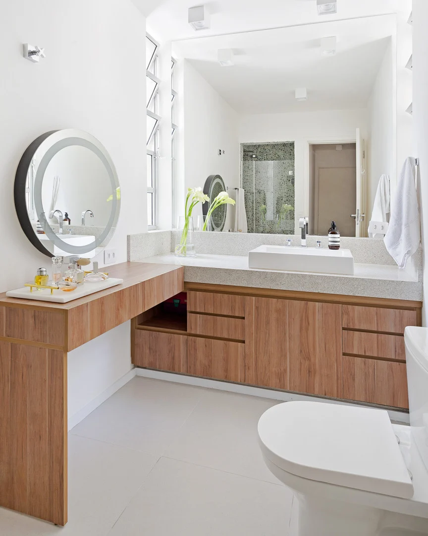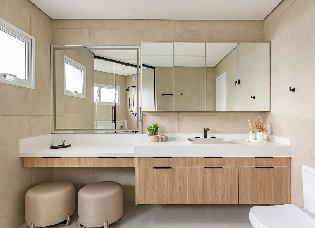 Existem muitos aspectos que levamos em consideração. Nesse quesito, o espelho, a iluminação, o material e as vantagens de cada um são o principal.