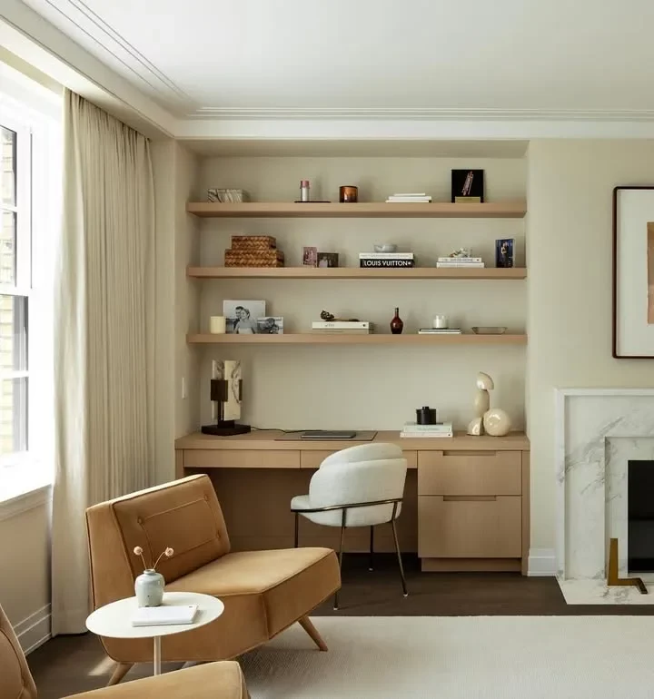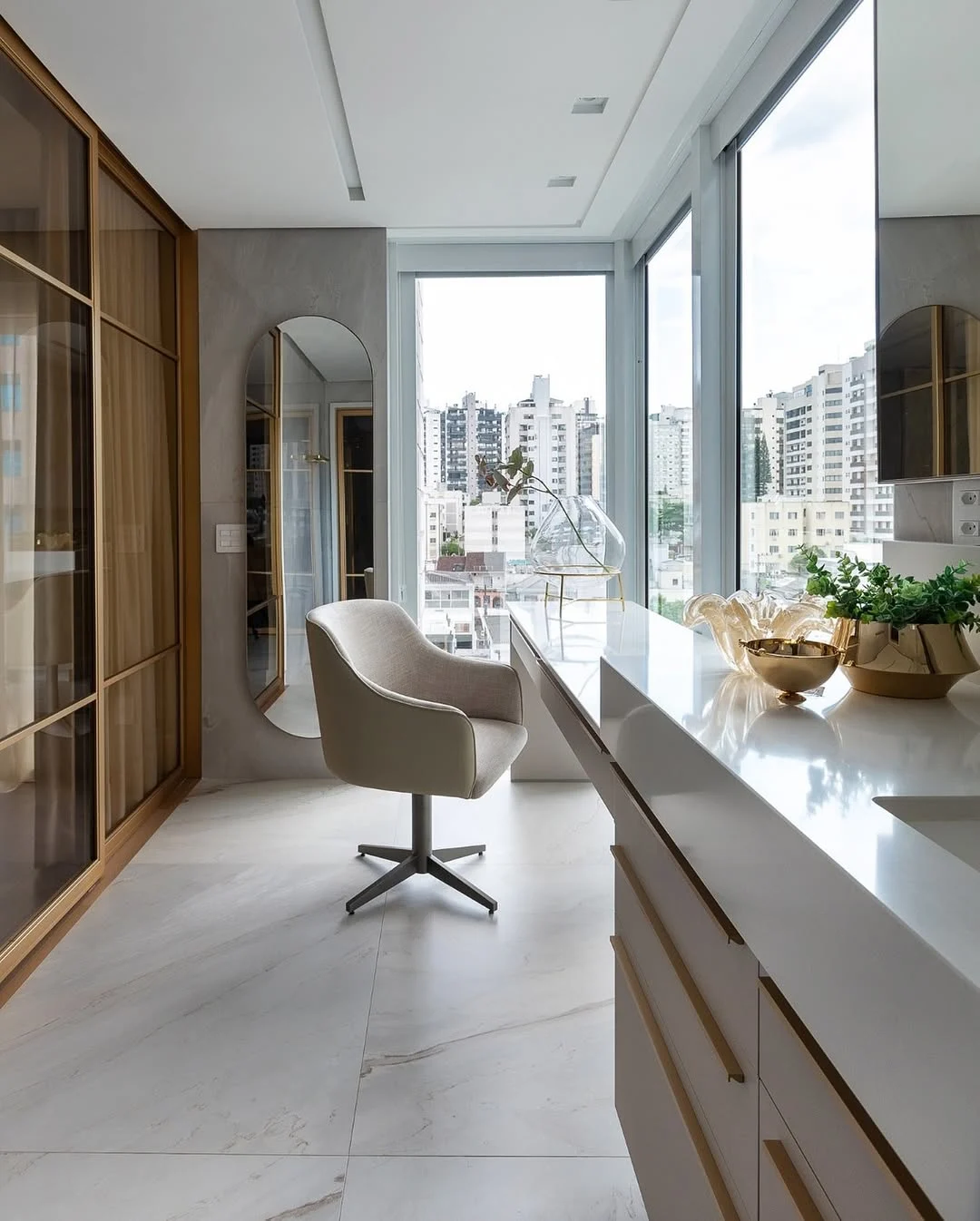 Se você já tem um home office, seja no quarto ou num cômodo reservado mesmo, dá para conciliar a penteadeira junto! Esse tipo de adaptação é perfeita para quem não pode ocupar muito espaço.