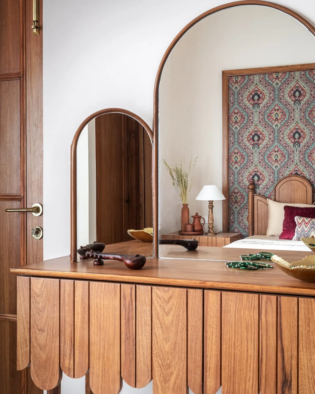 Penteadeira com espelho em arco grande e pequeno de madeira.