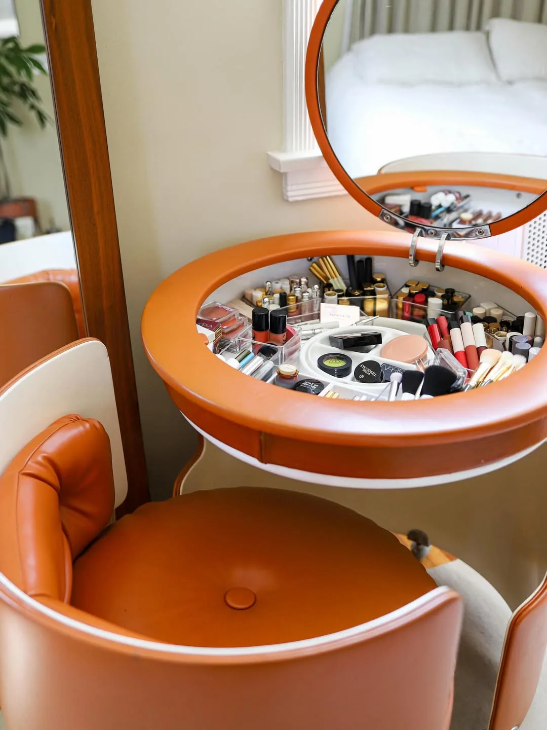 A maioria das penteadeiras retrô possuem um espelho com moldura mais esculpida e puxadores bem trabalhados. Se já tiver visto uma dessas na casa da sua avó, então percebeu também que elas possuem muito espaço! Elas costumam ser cheias de gavetas, sendo uma opção incrível para quem tem muito produto.