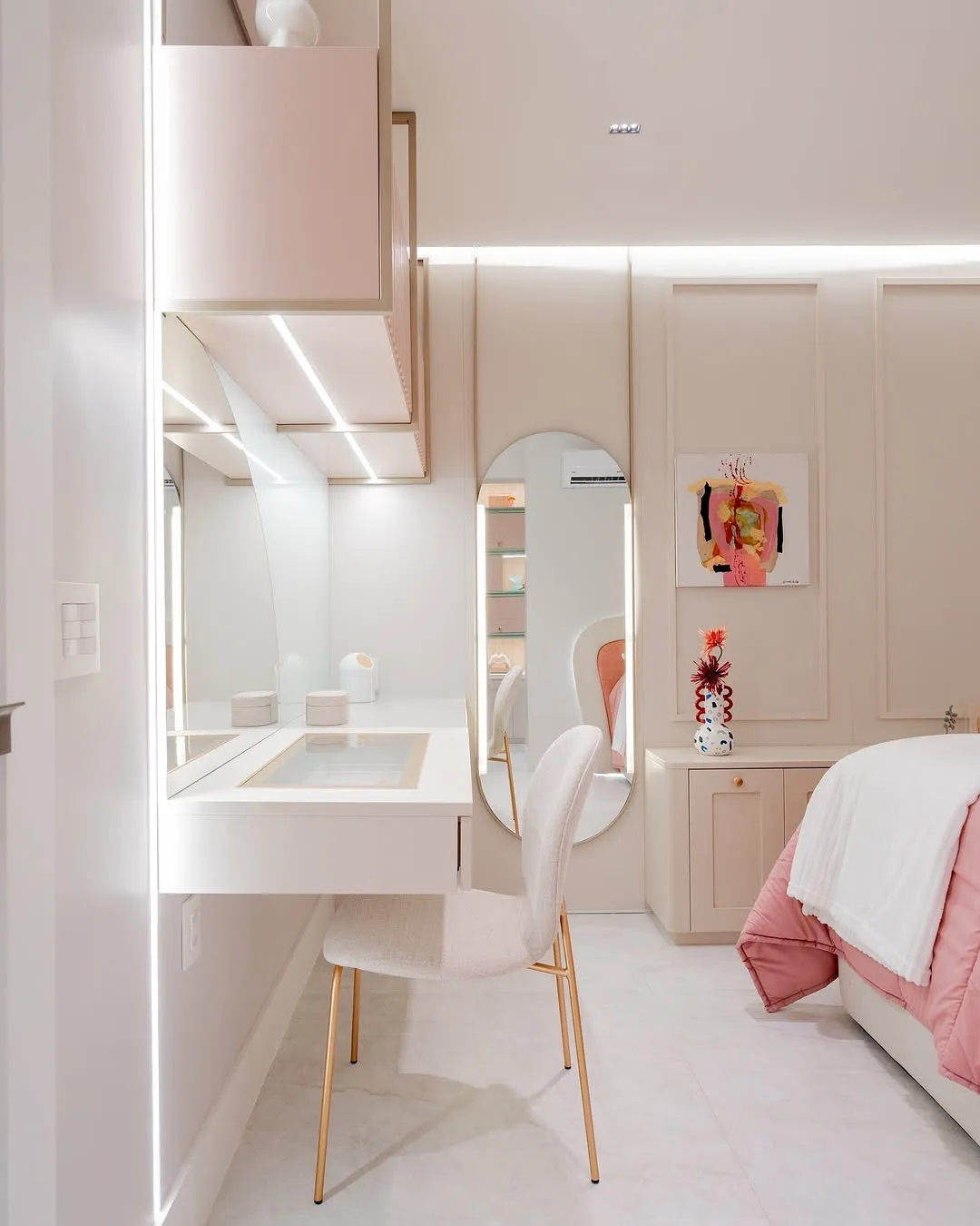 Aqui, alguns modelos de penteadeira podem ser mais ideais para quem tem muito espaço e, outros, para quartos pequenos. Ainda, tem até mesmo a opção de embutir esse móvel junto de uma escrivaninha, perfeito para ter mais praticidade na rotina.