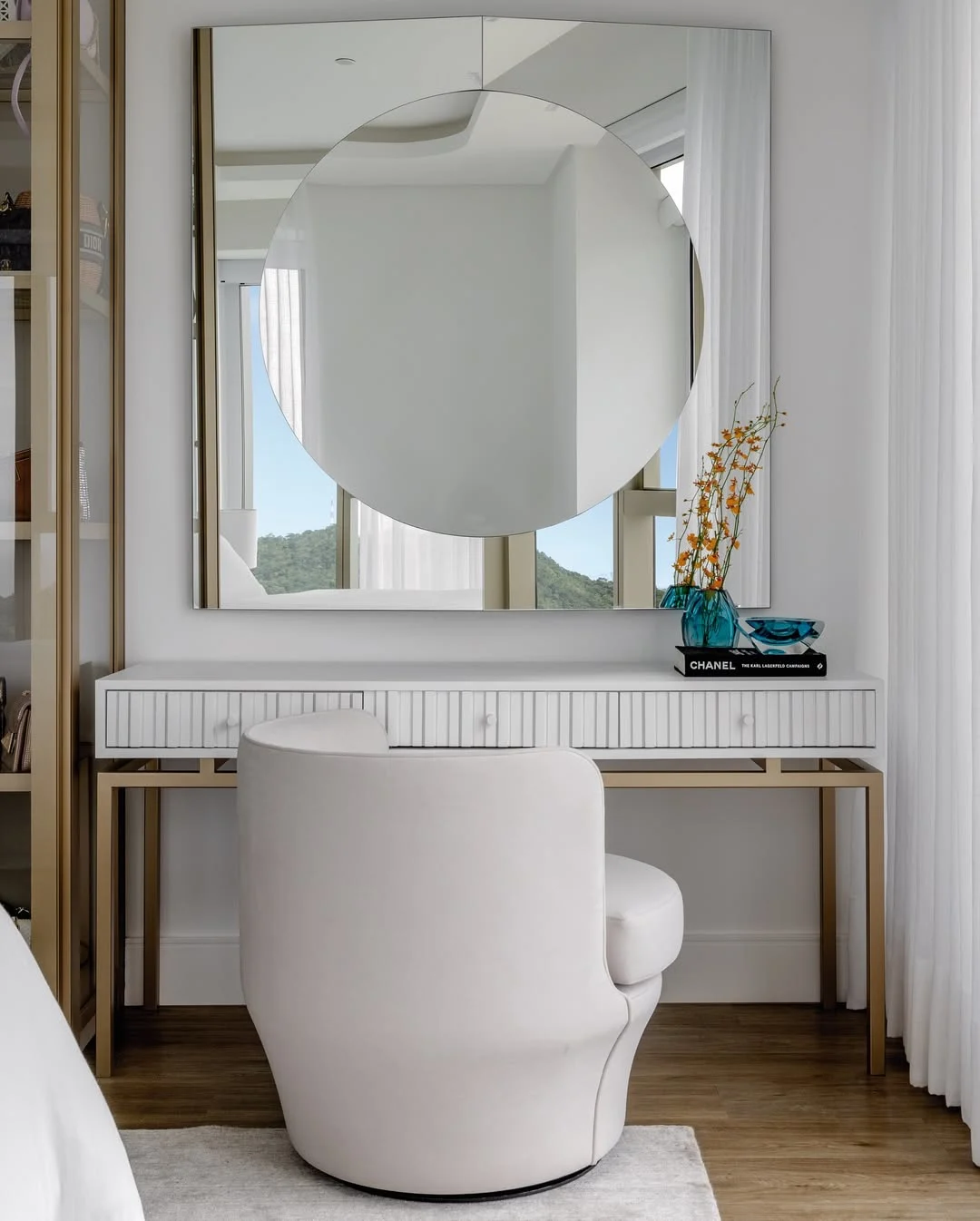 Por fim, a decoração da penteadeira faz toda a diferença. Flores, velas, porta-retratos ou pequenas esculturas ajudam a personalizar o espaço.