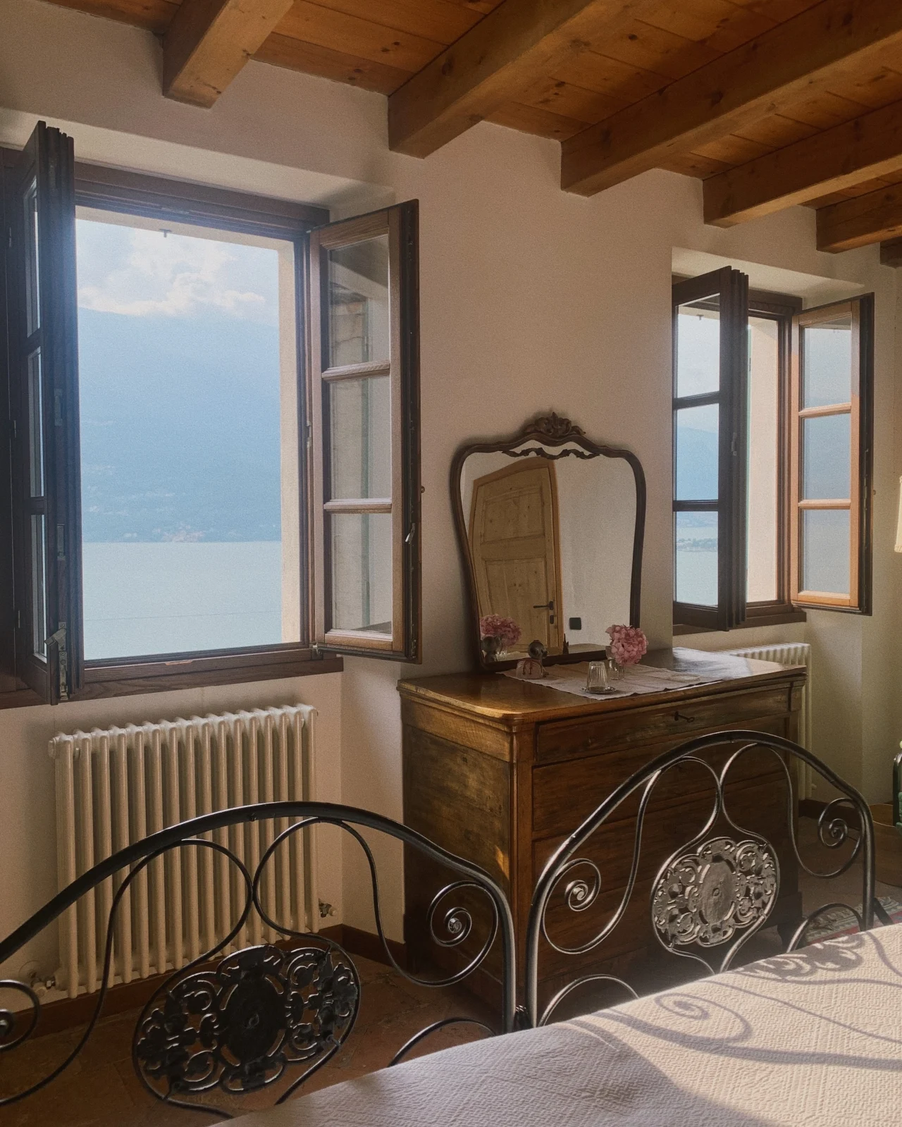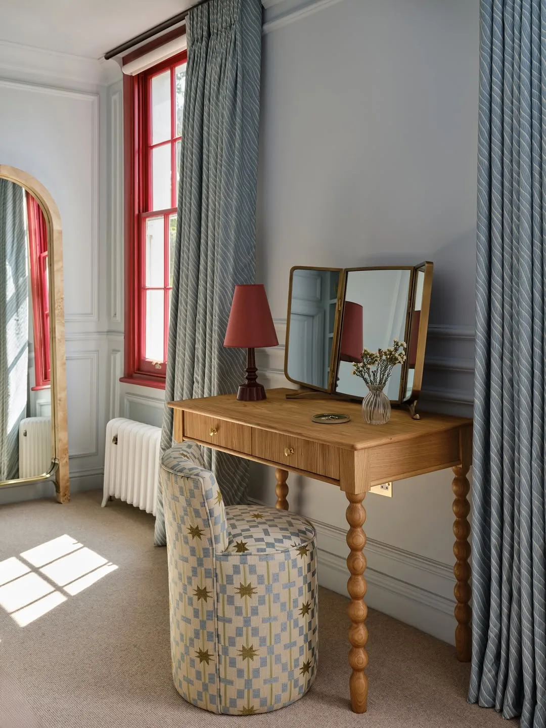 Penteadeira retrô com espelho redondo, gavetas e de frente para muitas janelas do quarto.