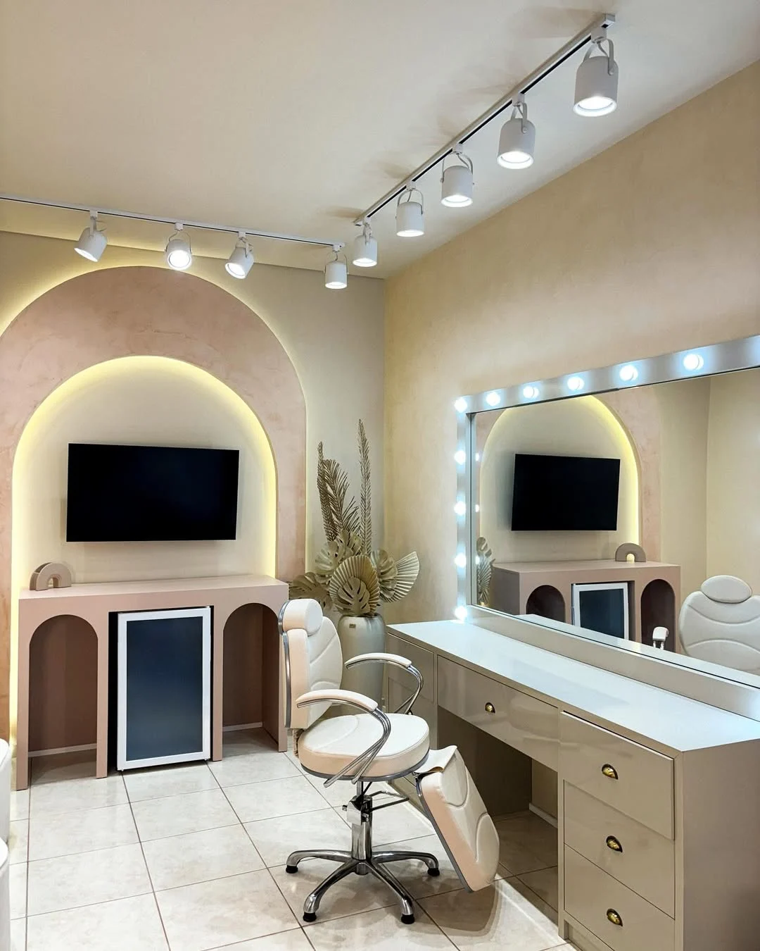 O que eu recomendo aqui é investir em uma cadeira ou banco que combine com essa estética da penteadeira. E não se esqueça de buscar algo bem confortável! É aqui que você vai passar a maior parte do seu tempo na rotina de autocuidado.