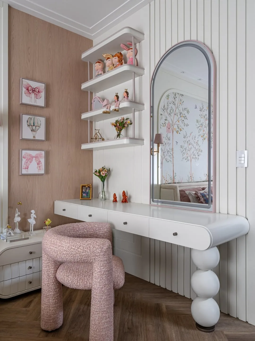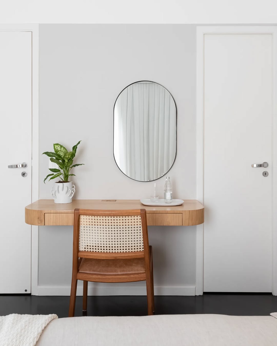 E, claro, escolher um espelho que combine com a penteadeira suspensa é super importante! Você pode investir em um modelo redondo, orgânico ou retangular. Mas lembre de investir também na iluminação. Afinal, é aqui que você vai se maquiar por muito tempo!