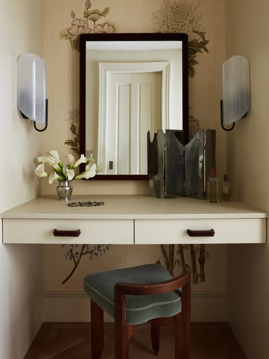 Penteadeira suspensa num cantinho com arandelas ao lado e visual mais retrô.