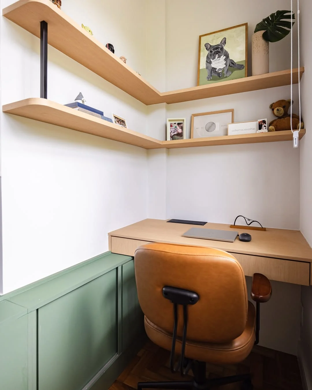 No escritório, as prateleiras oferecem uma solução prática para organizar documentos e materiais de trabalho. Além de funcionais, elas ajudam a manter o ambiente visualmente agradável. Para quem trabalha em home office, esse recurso se torna ainda mais valioso!