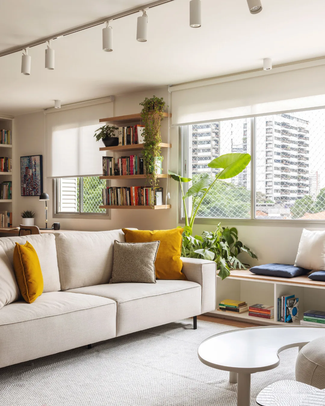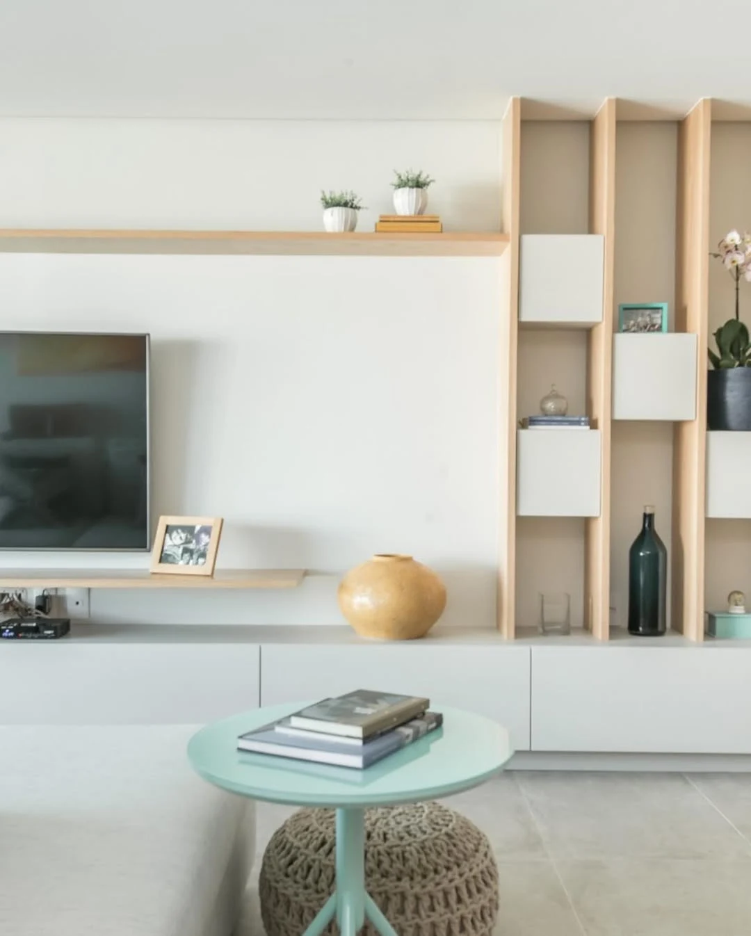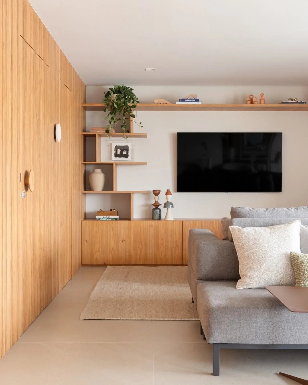 Já na sala de estar, as prateleiras de madeira são ainda mais versáteis. Além de caberem em qualquer estilo e tamanho, elas desempenham muitos papéis na decoração. Aqui, você pode usar para fazer uma pequena biblioteca e colocar livros.