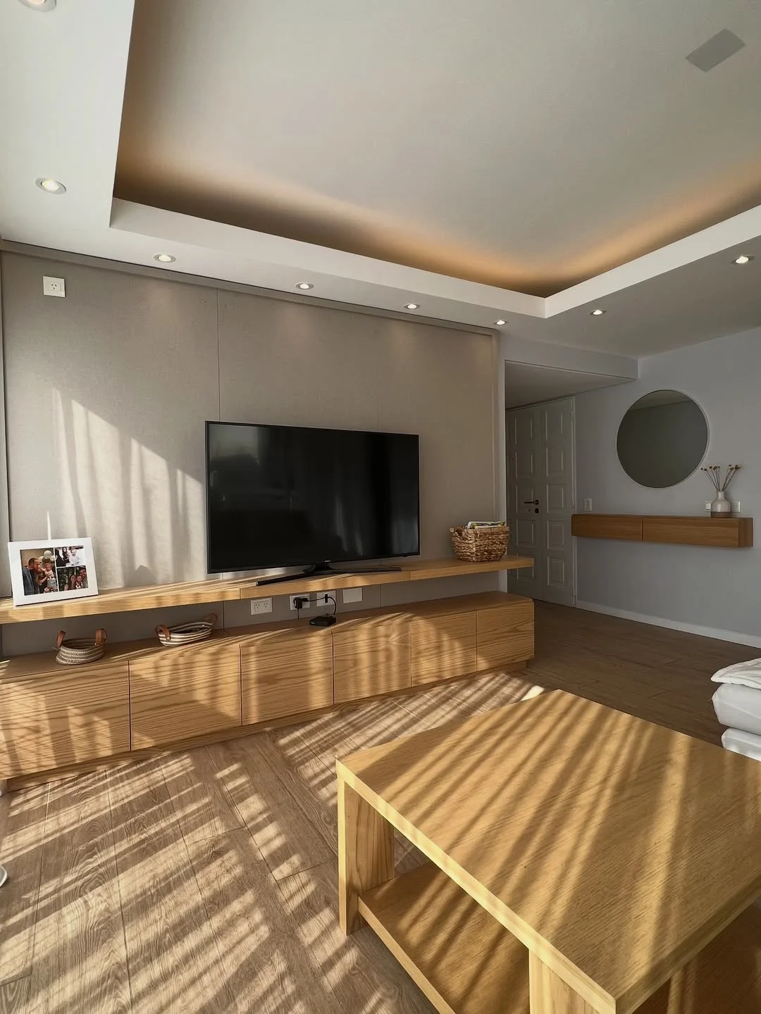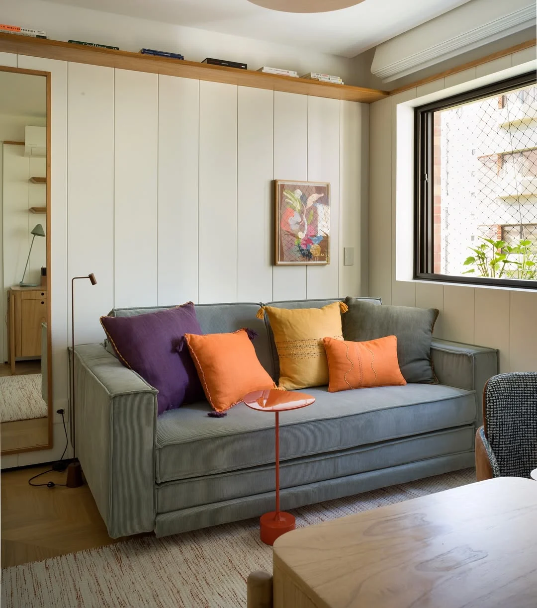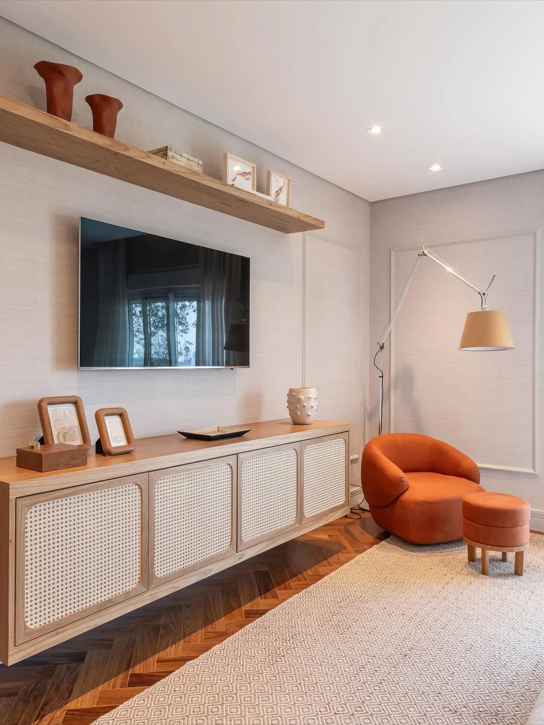 Já na sala de estar, as prateleiras de madeira são ainda mais versáteis. Além de caberem em qualquer estilo e tamanho, elas desempenham muitos papéis na decoração. Aqui, você pode usar para fazer uma pequena biblioteca e colocar livros.