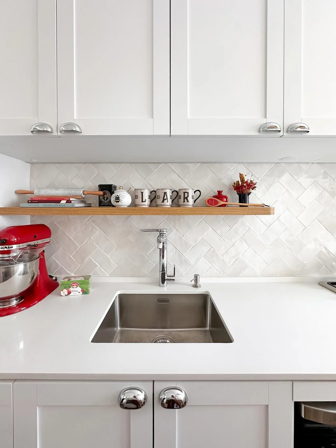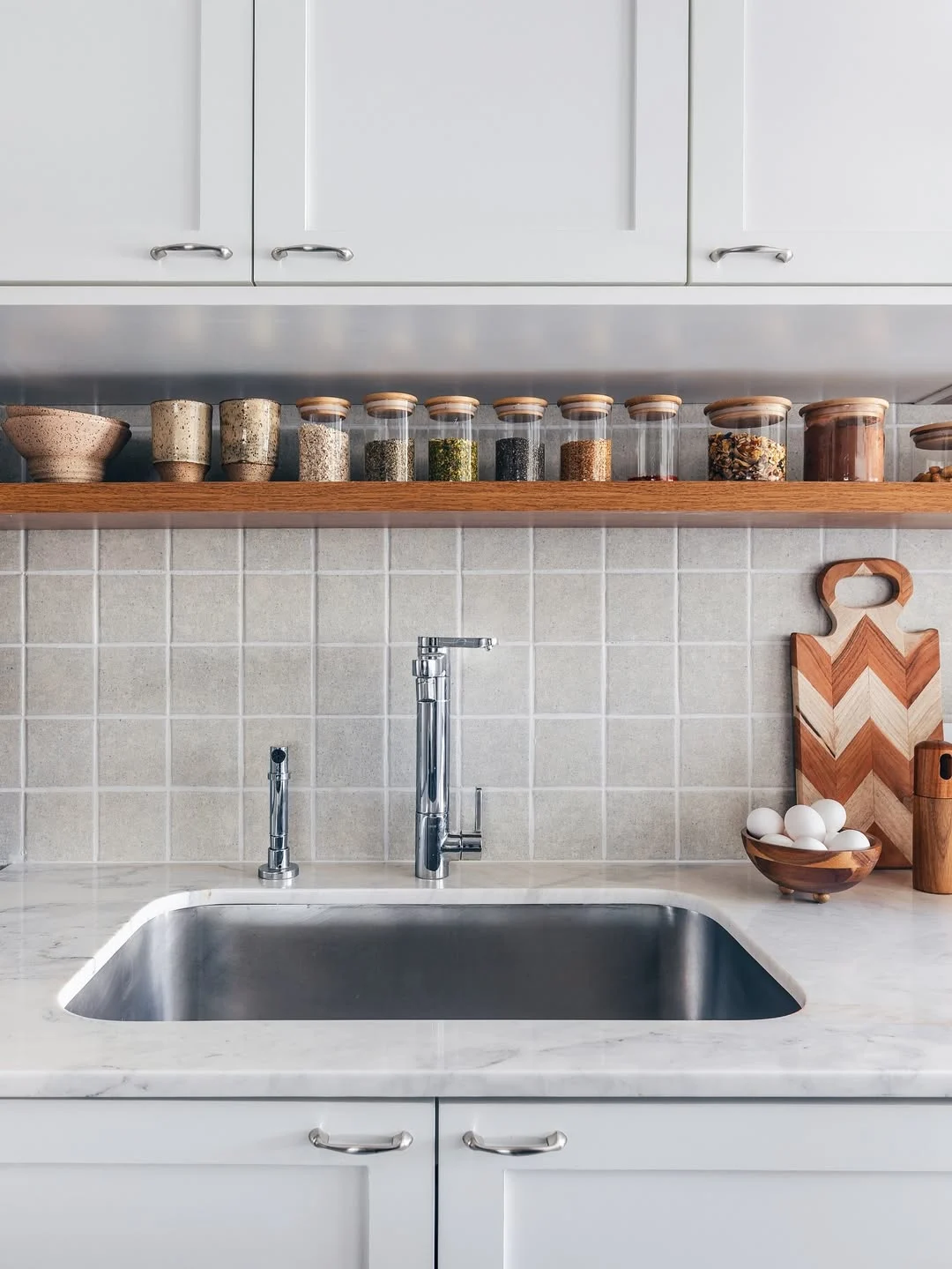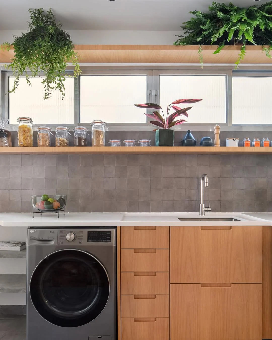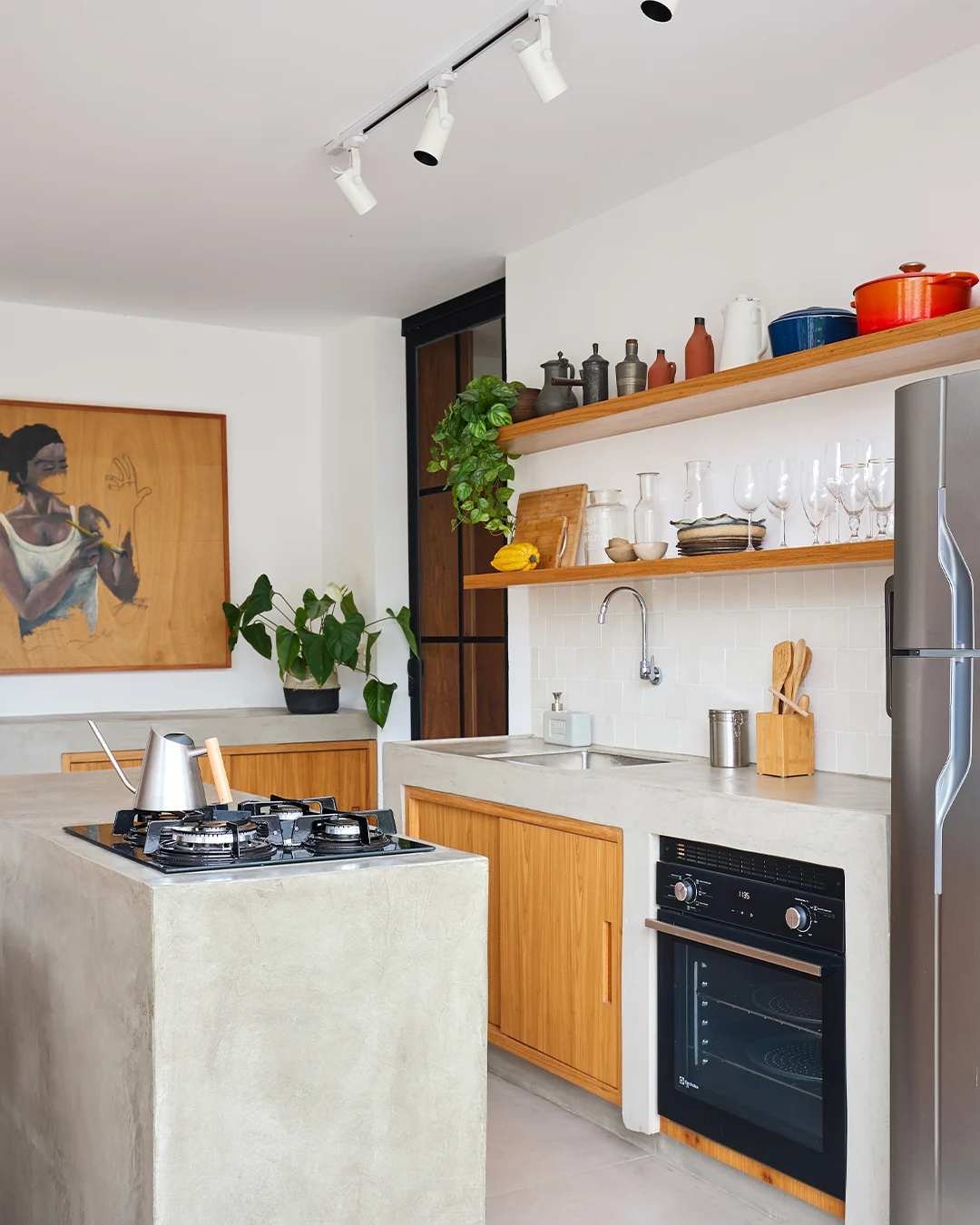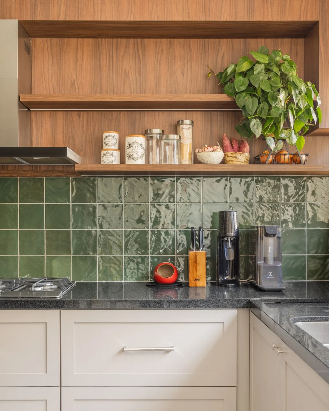 A prateleira de madeira pode ser muito bem utilizada na cozinha. Se você gosta de deixar alguns itens expostos, como pequenos eletrodomésticos, louças e enfeites, como livros de receita, essa é uma excelente alternativa. Mas, ela também é super funcional, perfeita para guardar seus temperos mais usados no dia a dia.