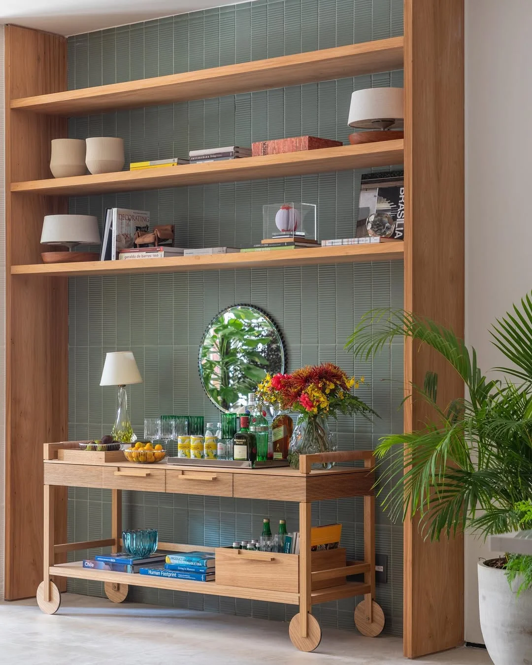 A prateleira é um item que, em casa, é sempre muito versátil. Mas, no caso das prateleiras de madeira, elas são ainda melhores, já que esse é um tipo de material que deixa qualquer ambiente mais convidativo. Por ser natural, ela traz essa dose extra de charme que a gente ama!