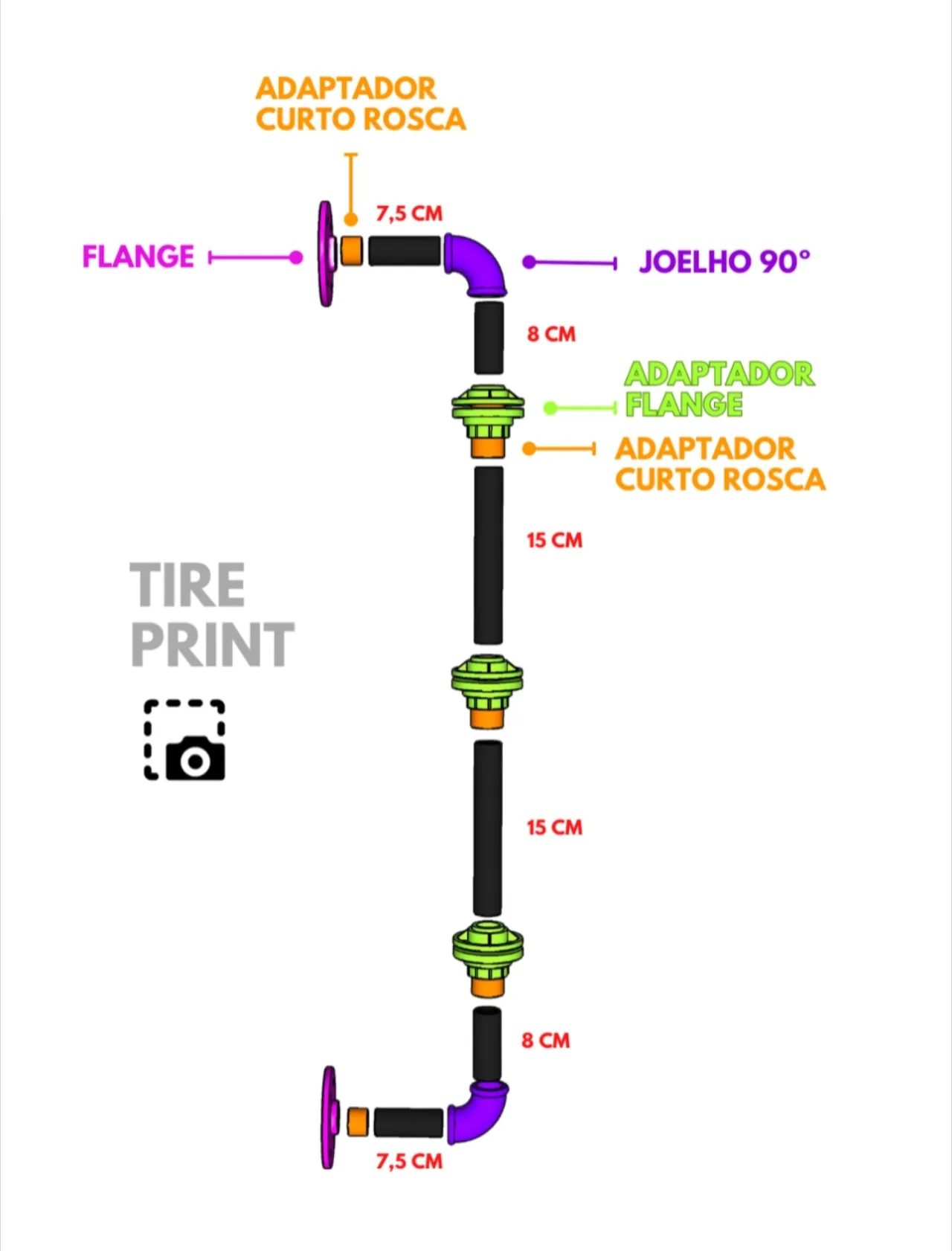 Eu comecei encaixando a flange, o adaptador curto rosca e o cano de 7,5 cm. Depois, juntei esses pedaços com o joelho e outro cano de 8 cm. Essa é a primeira parte da estrutura, que vem seguida do adaptador flange e outro adaptador curto rosca. Você pode repetir esse mesmo processo duas vezes para montar a sua prateleira móvel.