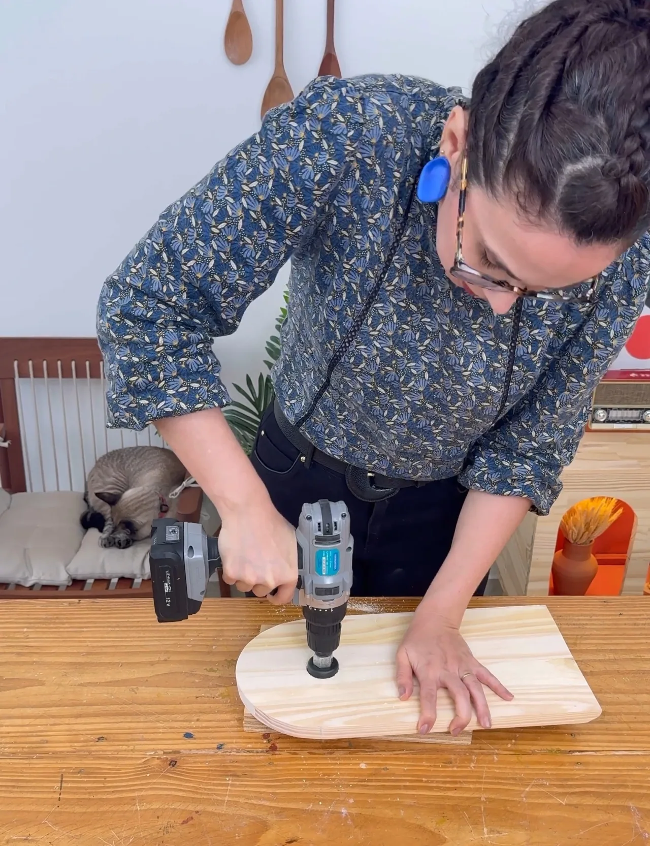 Enquanto os canos secavam, eu peguei as tábuas de madeira e fiz furos nas pontas arredondadas. Para isso, usei a broca serra copo. Esses espaços vão ser muito importantes na etapa de montagem, já que é por ali que a prateleira móvel ganha vida.