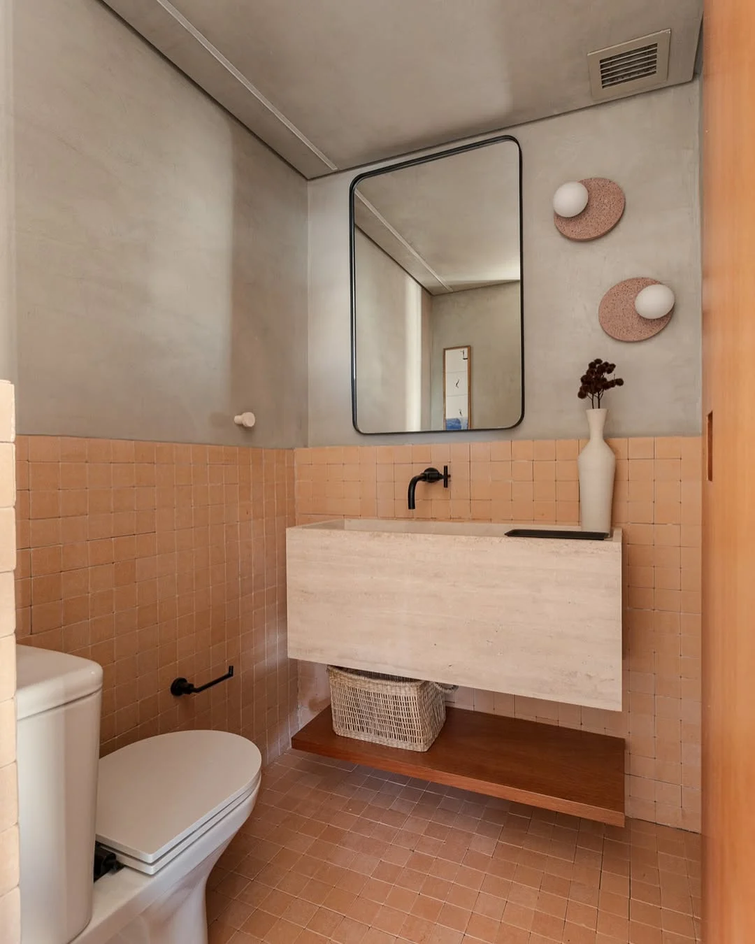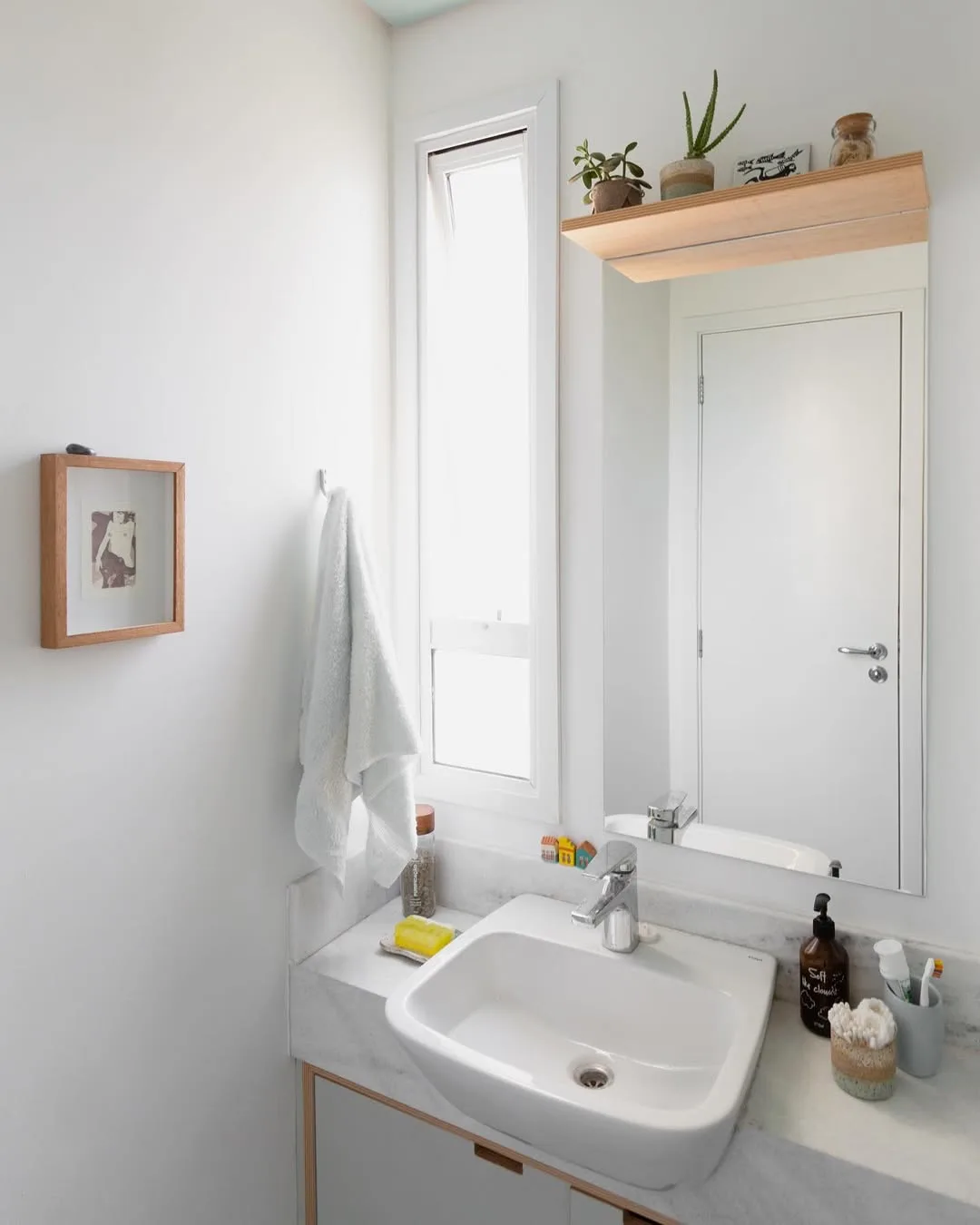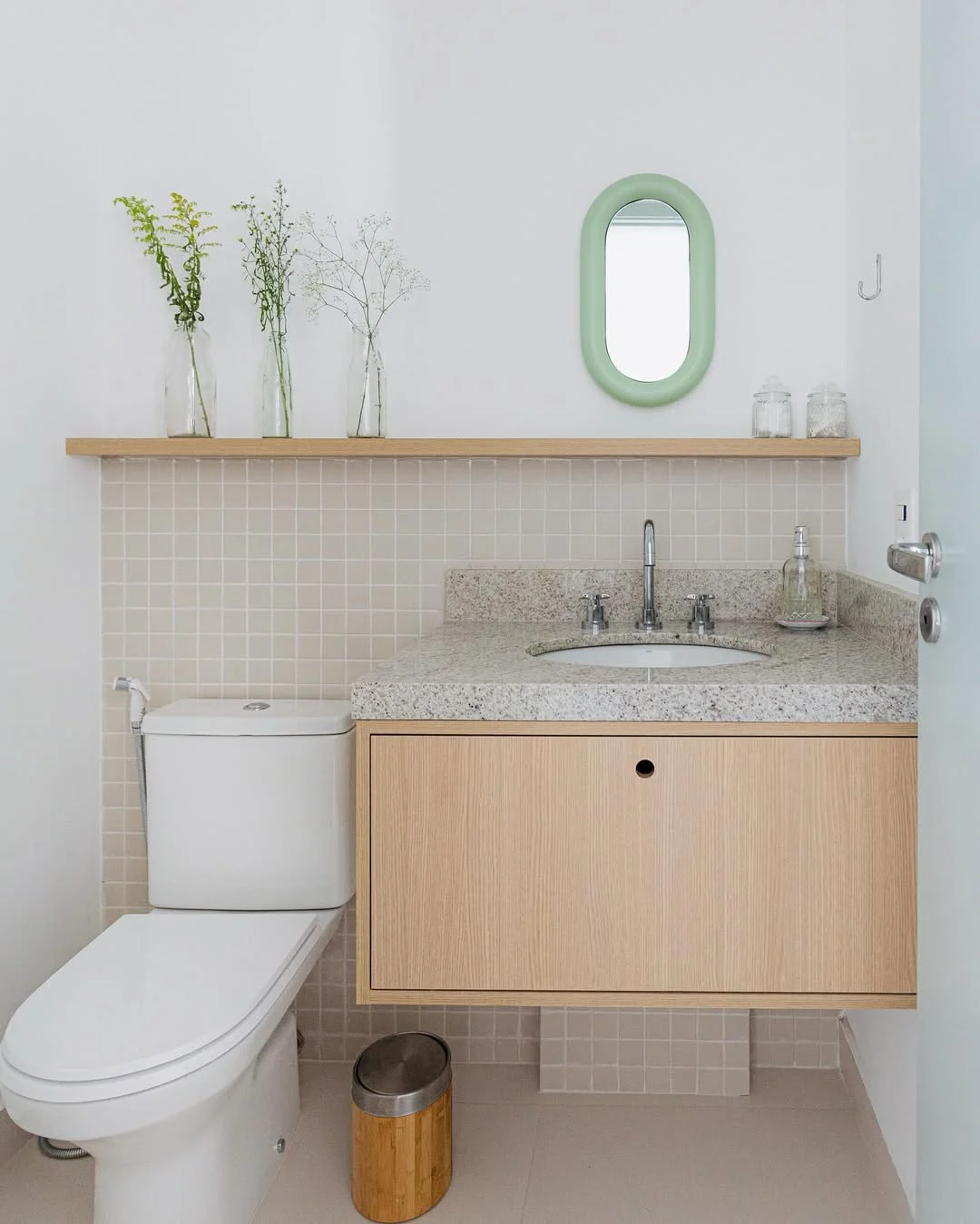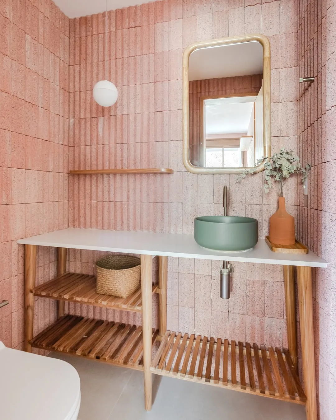 Prateleira madeira clara com vasos e espelho pequeno no lavabo.