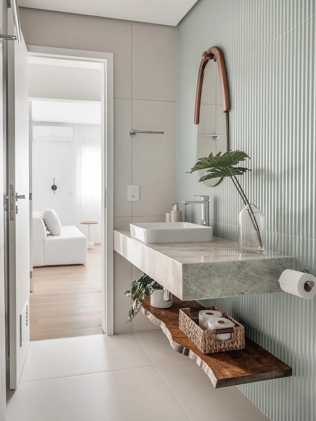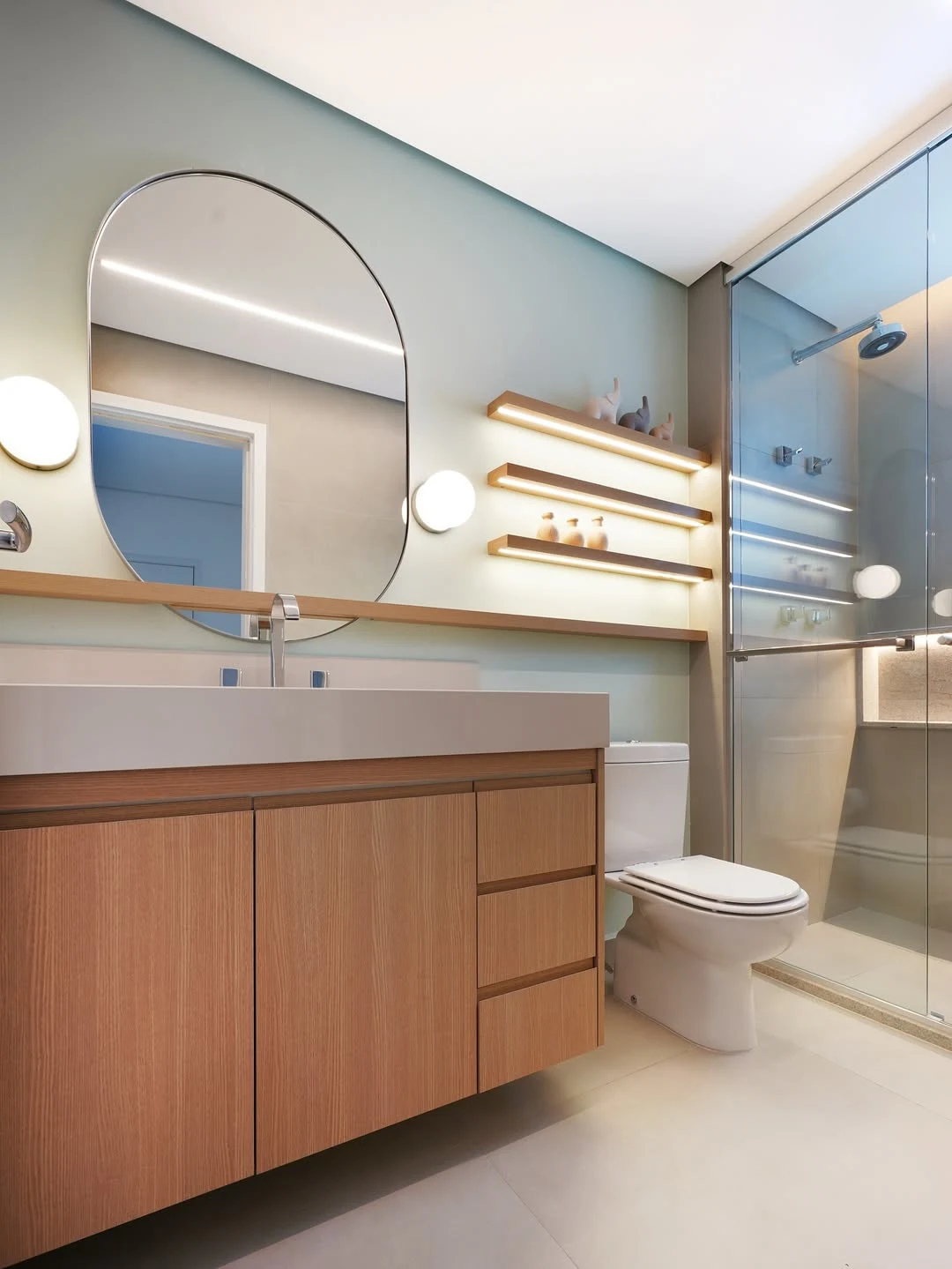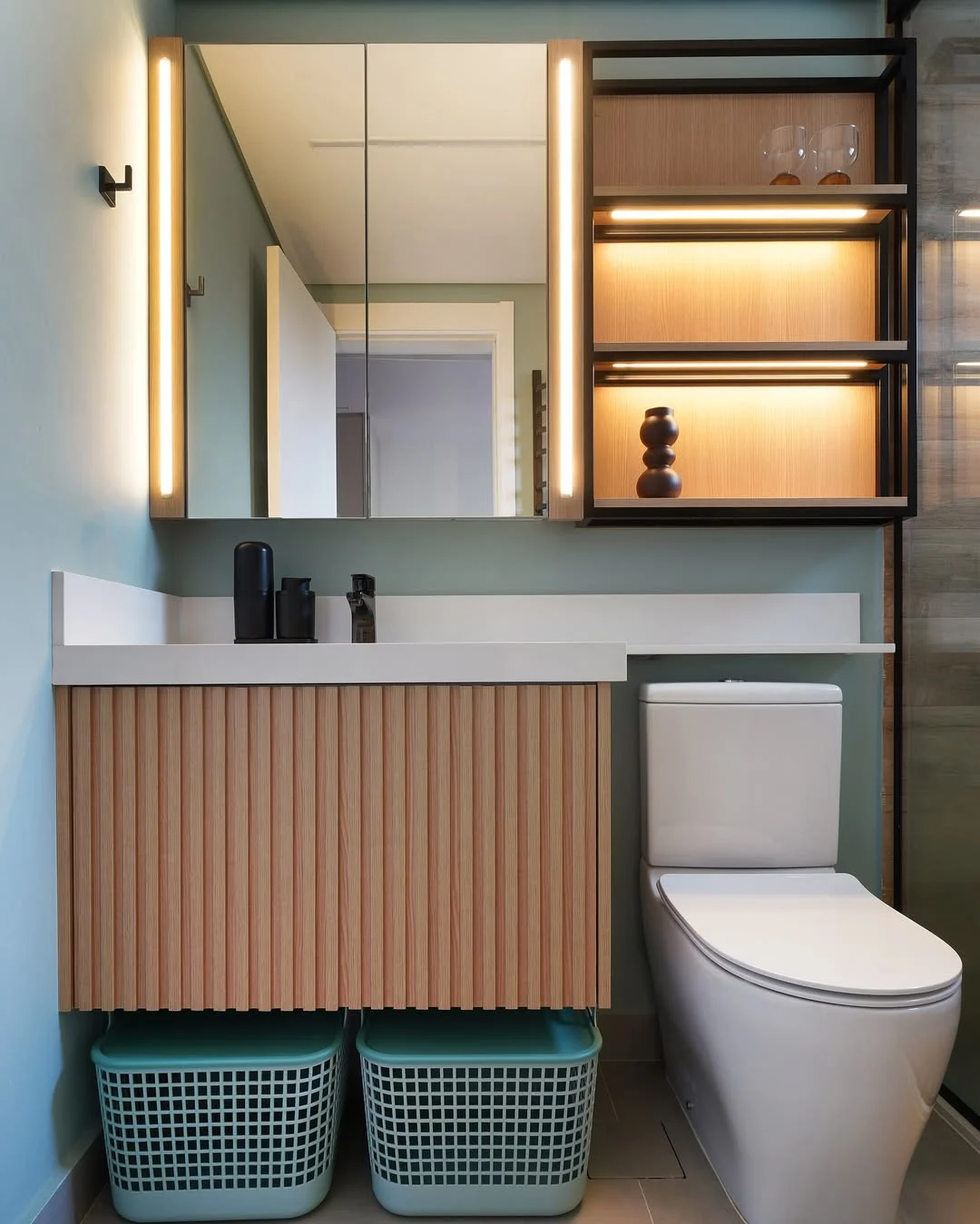 Prateleira iluminada ao lado do espelho e armário ripado.