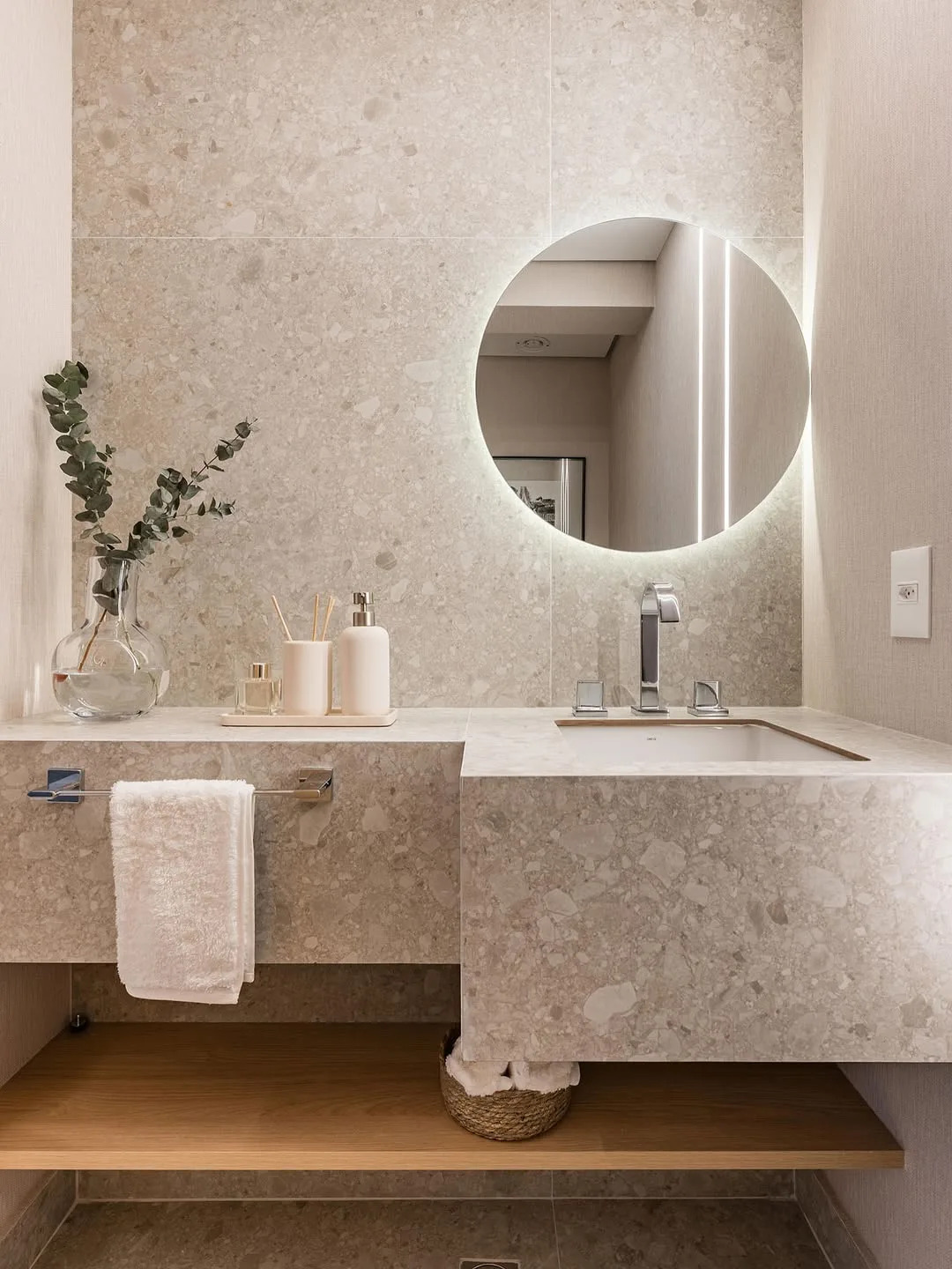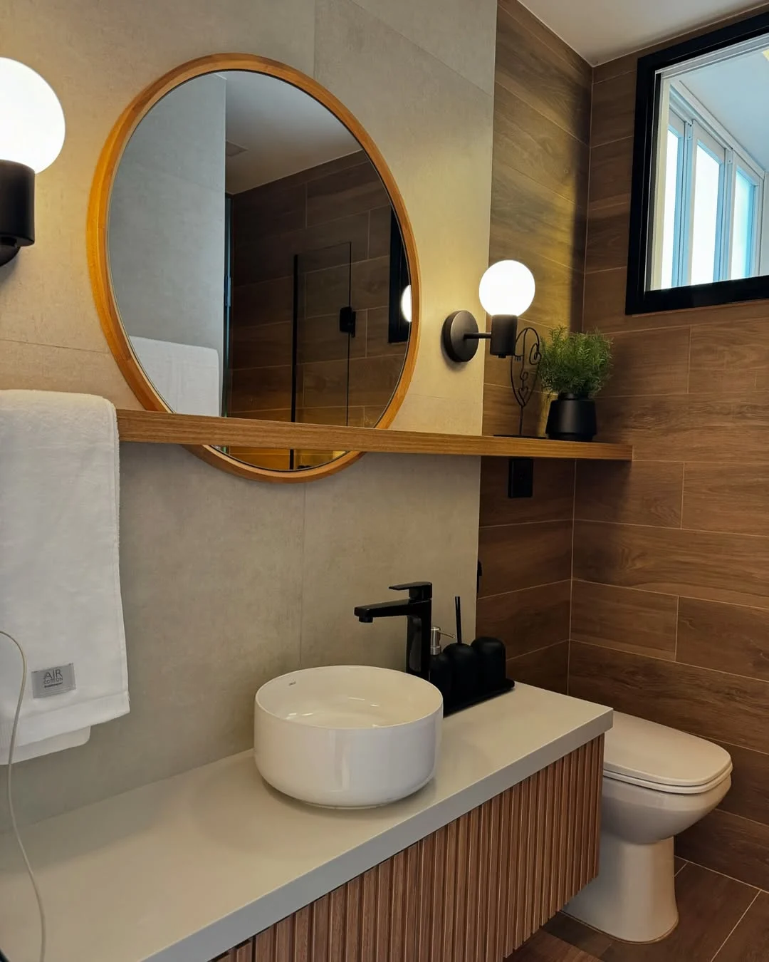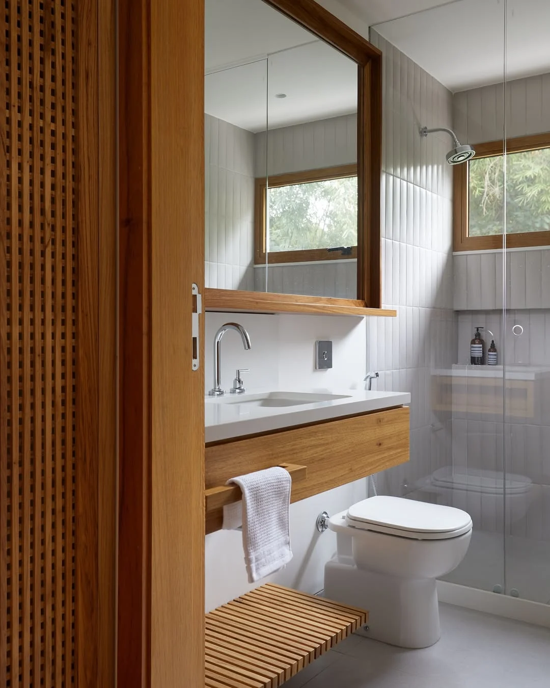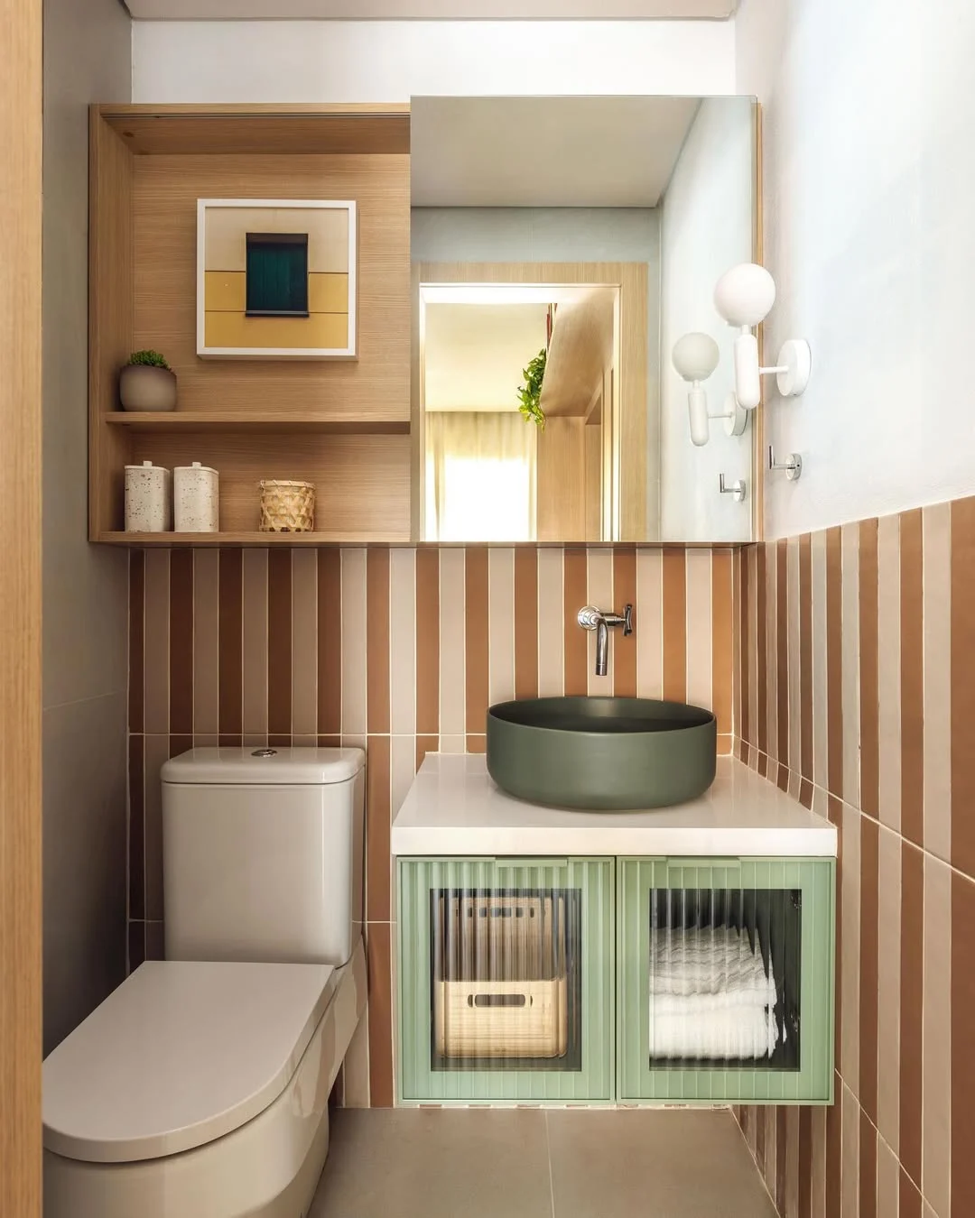 Prateleira iluminada ao lado do espelho e armário ripado.