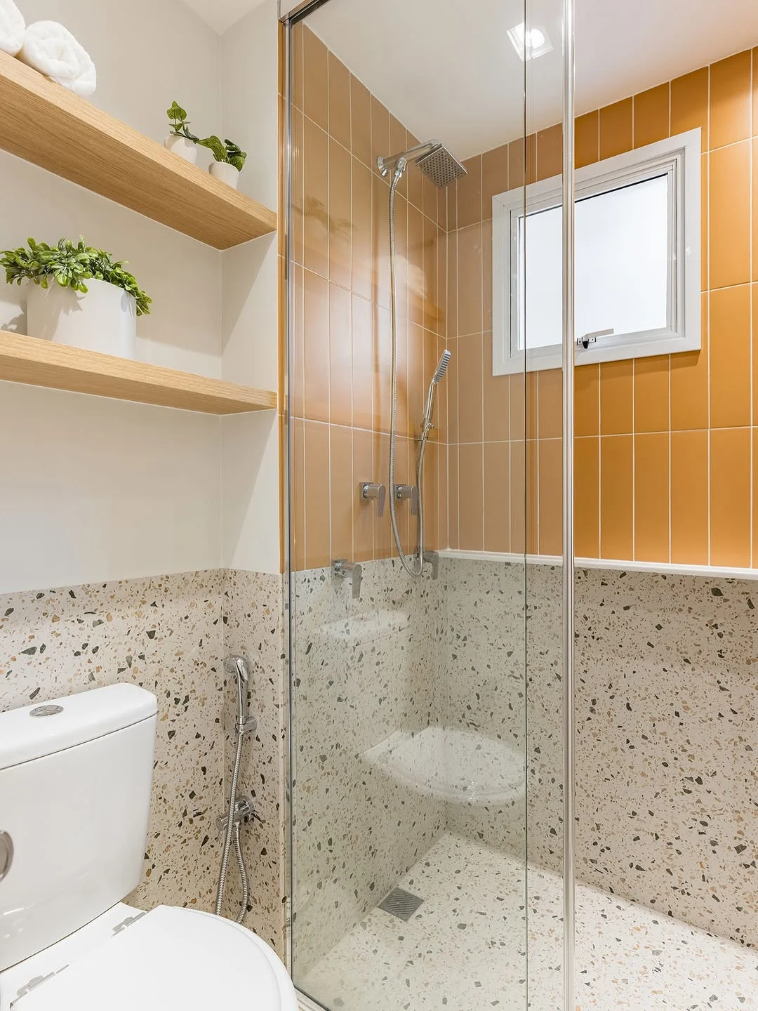 Prateleira de madeira acima do vaso e com azulejos laranjados no banheiro.