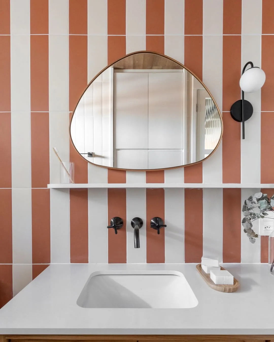 Prateleira branca abaixo do espelho na parede listrada.