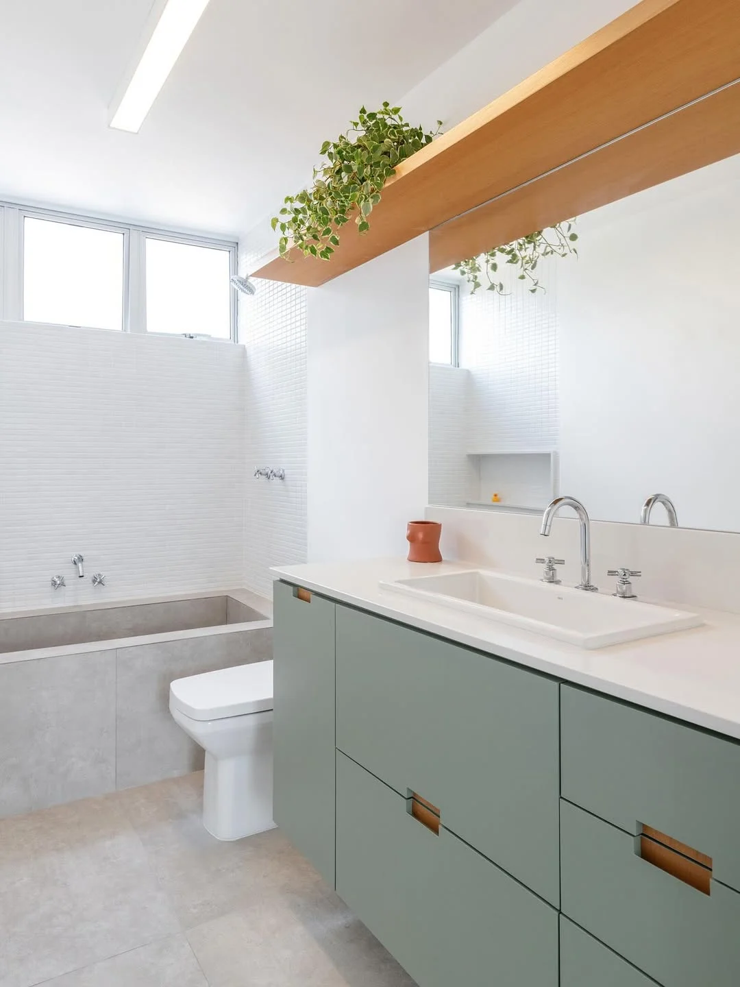Prateleira acima do vaso como extensão da pia.