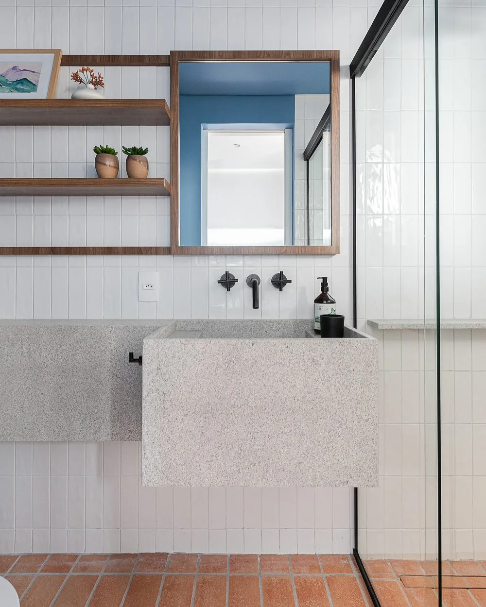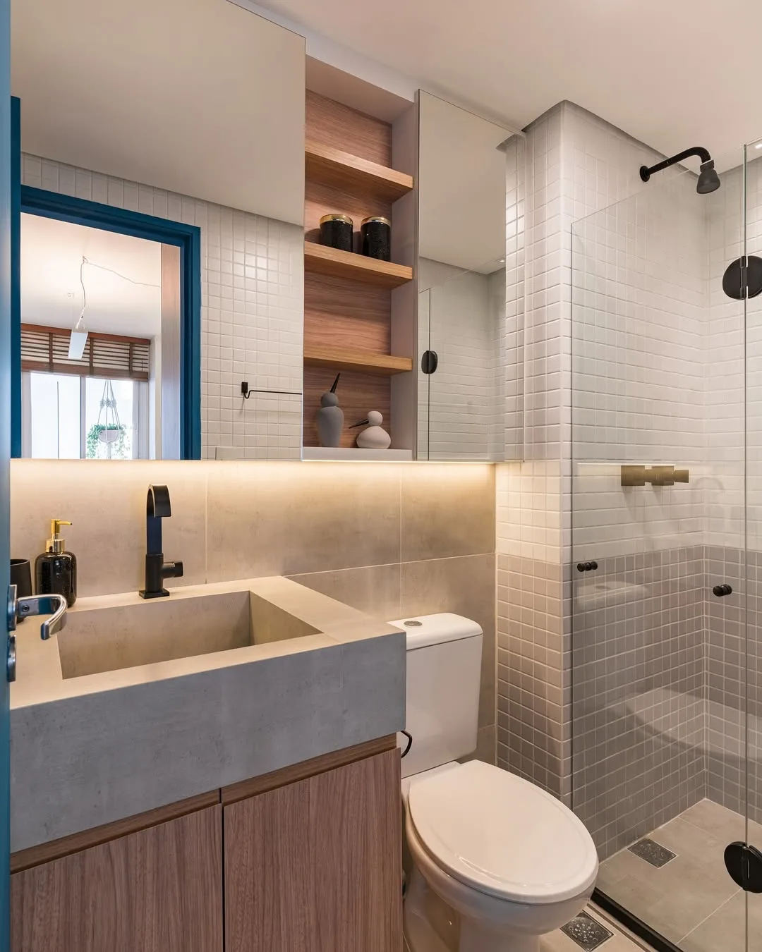 Por fim, os espelhos são ótimos locais para instalação de prateleiras no banheiro. Você pode colocar tanto em cima quanto embaixo dele que o resultado final acaba sendo moderno e cheio de personalidade.