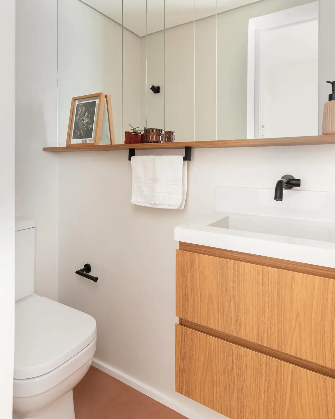 Mas, não só isso, como também é super possível usar para colocar um enfeite ou outro. Eu, particularmente, gosto muito de quadros e plantas. Isso dá um charme bem bonito e deixa o ambiente bem mais confortável! No Mania, já fiz um vídeo de como transformei um lavabo e lá usei prateleiras para decorar. O resultado ficou muito bonito!