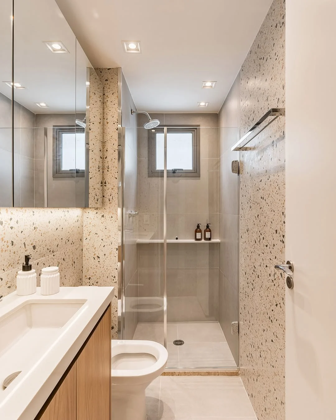 Modelo de nicho com prateleira perto do espelho e armário de vidro.