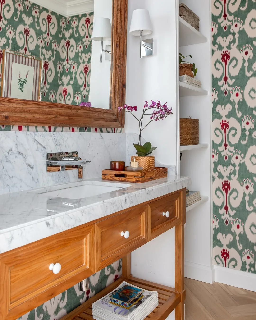 Prateleira de madeira clássica embaixo da pia e extensão do espelho.