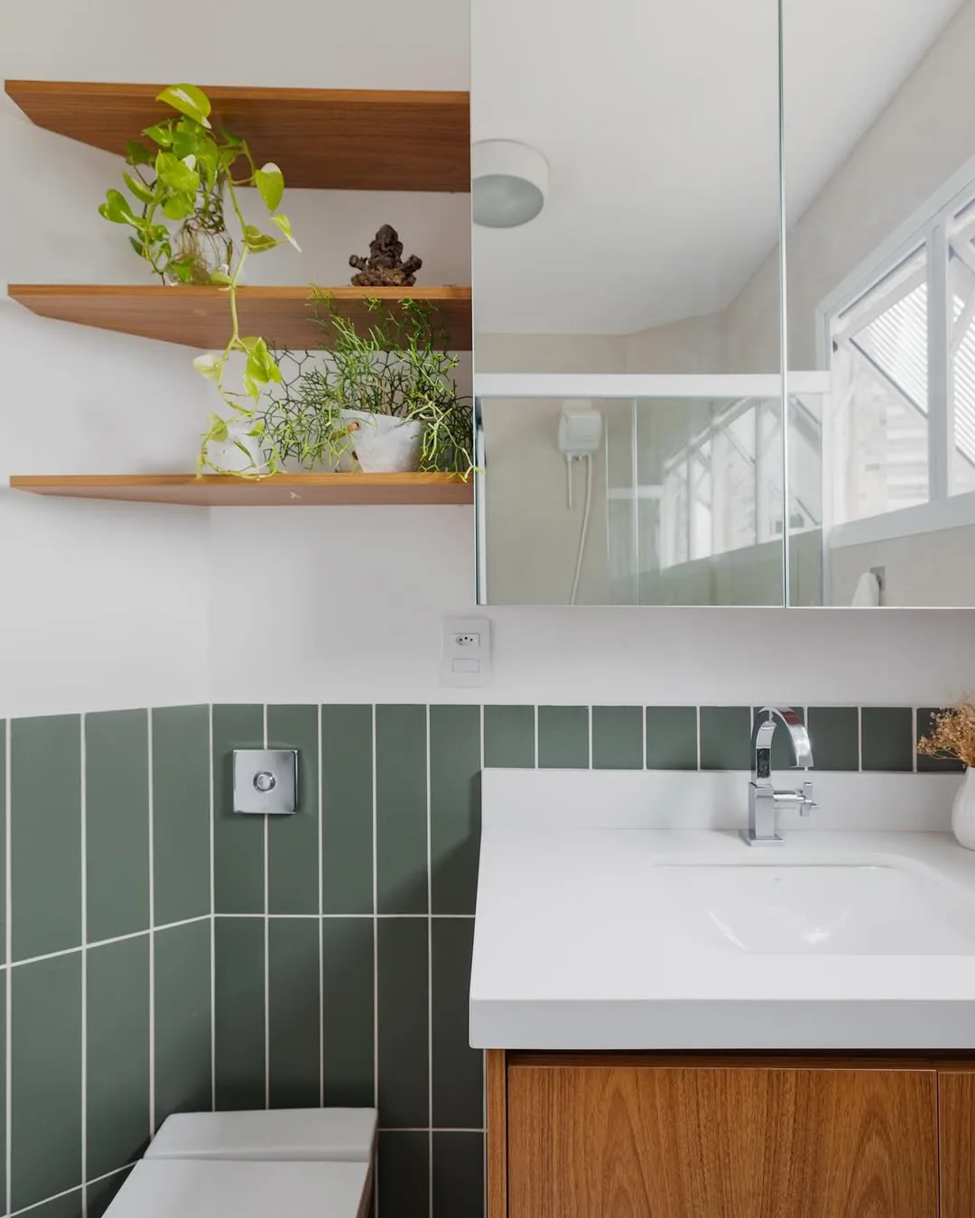 Prateleira acima do espelho da pia com planta.