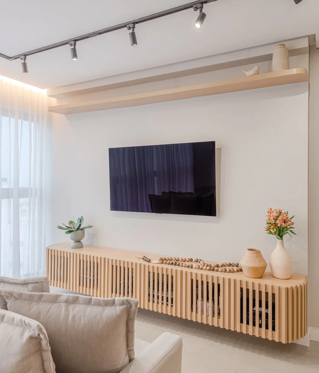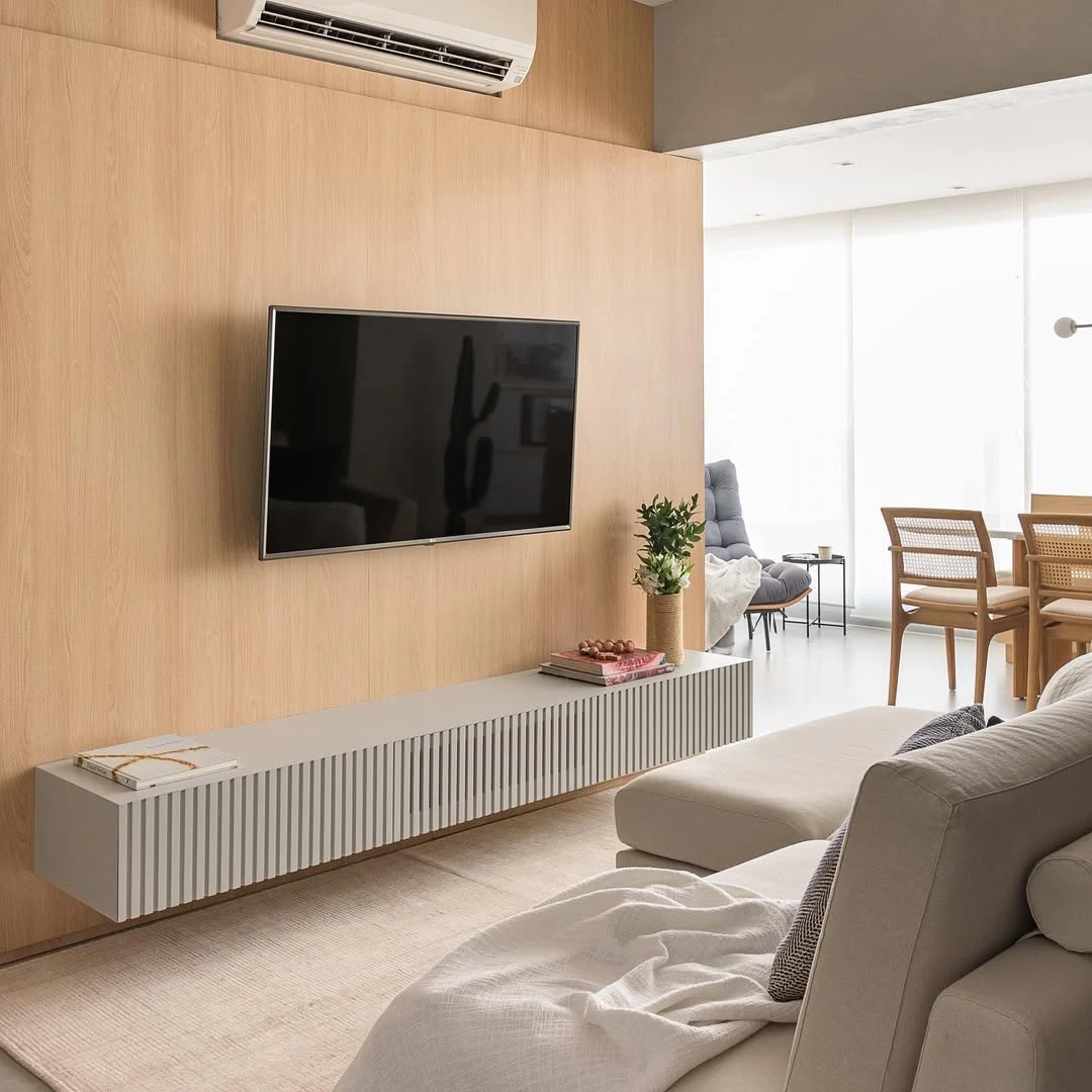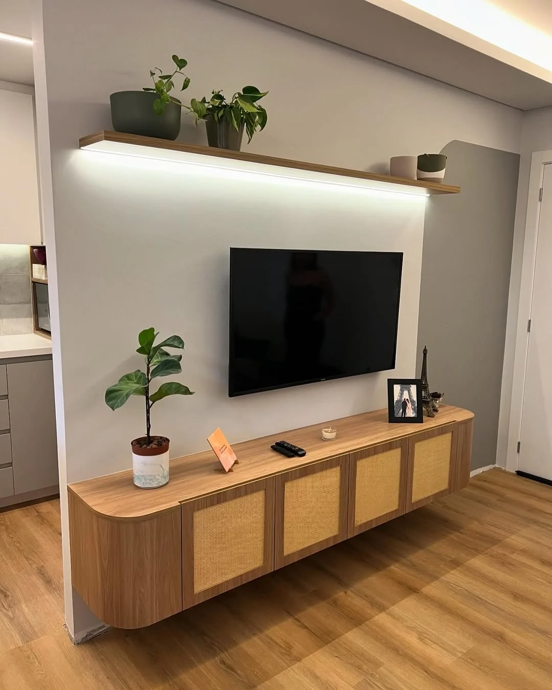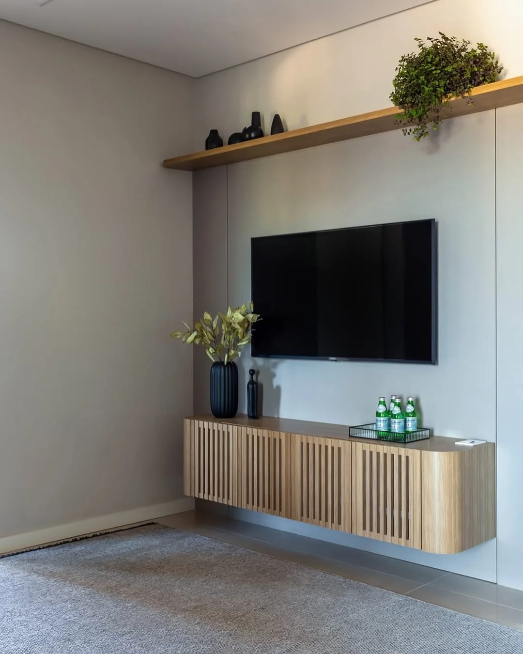 Em alguns modelos, o rack suspenso pode vir acompanhado por um painel de TV e ter compartimentos internos. Dá para optar por materiais como ripados para trazer mais textura ou, ainda, manter as superfícies lisas.