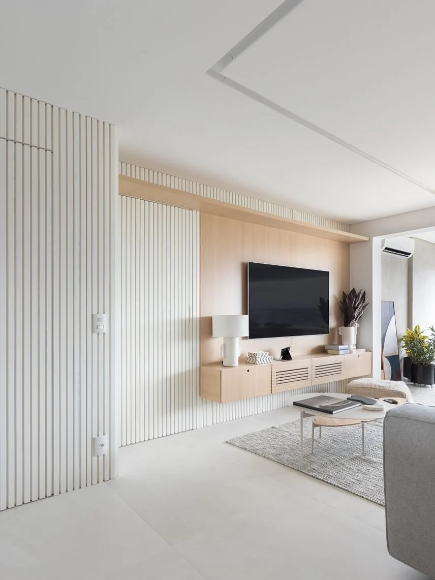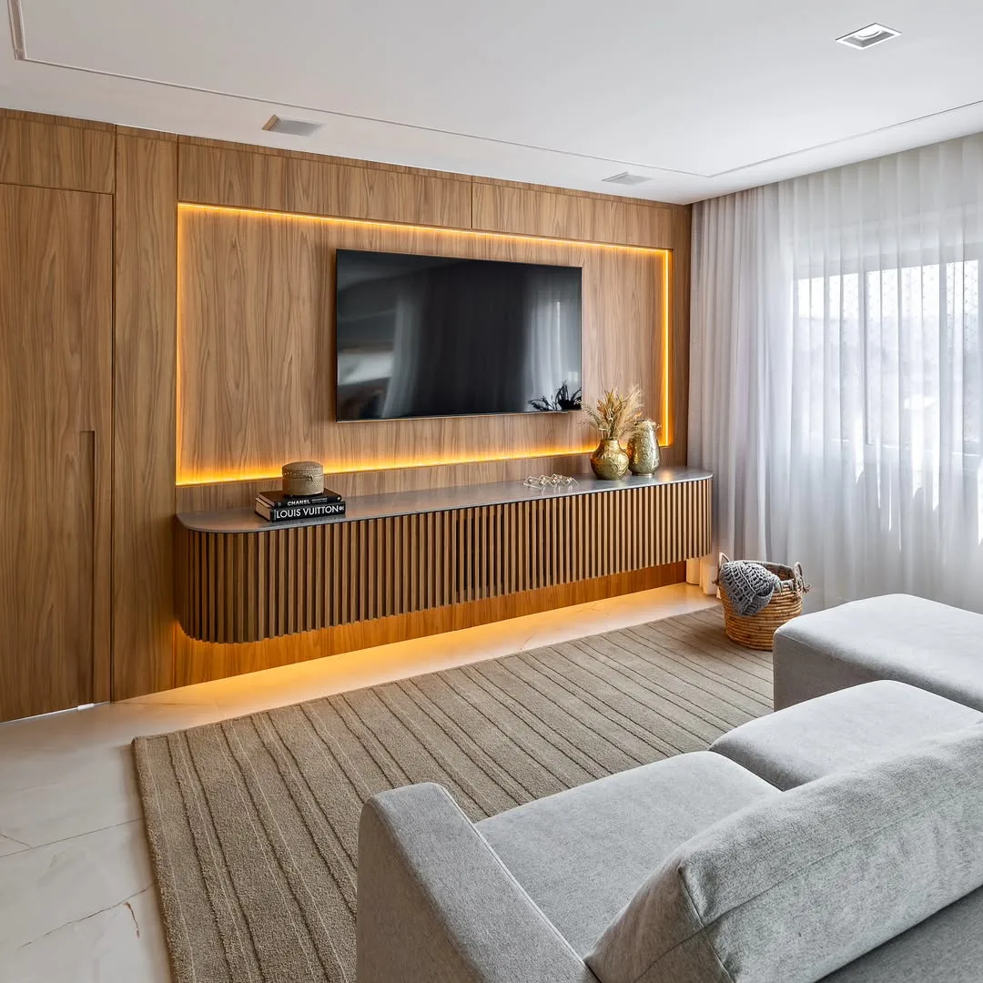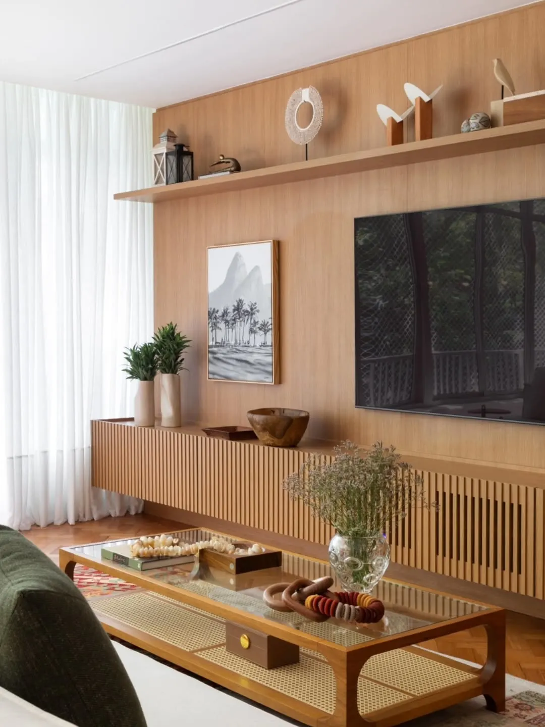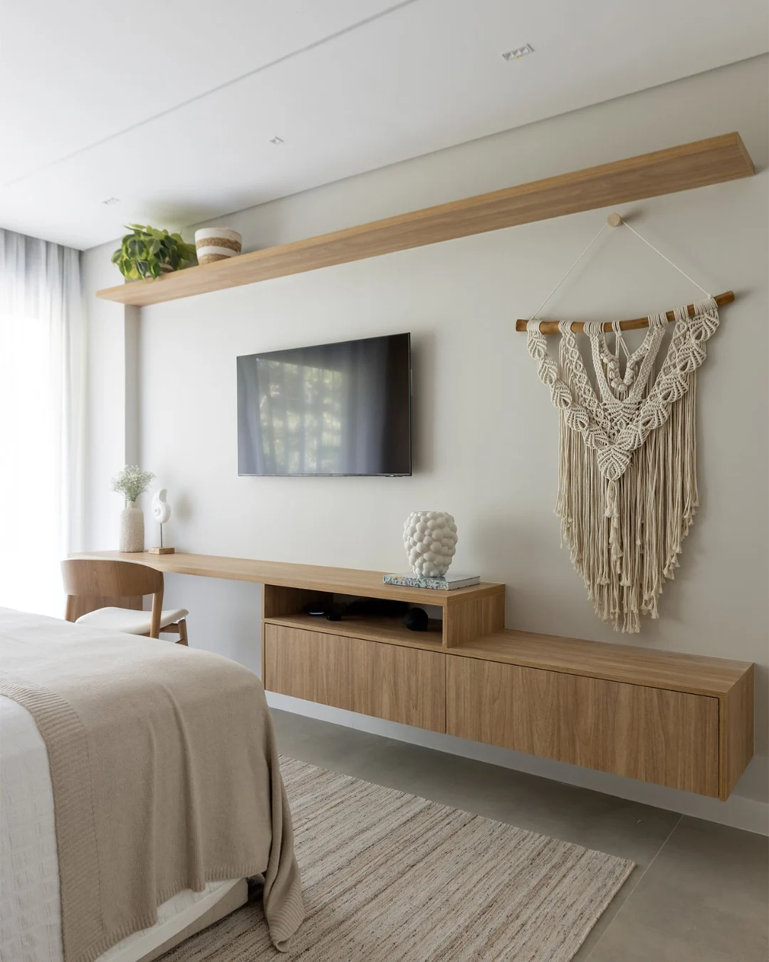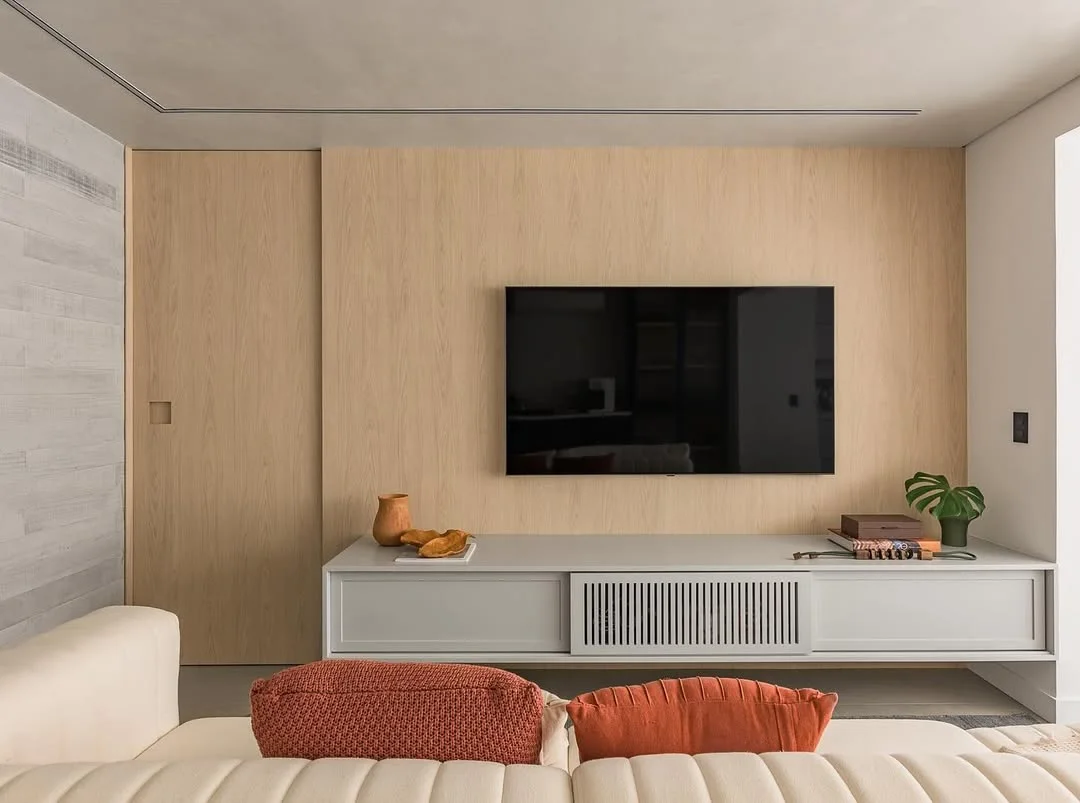 Em alguns modelos, o rack suspenso pode vir acompanhado por um painel de TV e ter compartimentos internos. Dá para optar por materiais como ripados para trazer mais textura ou, ainda, manter as superfícies lisas.