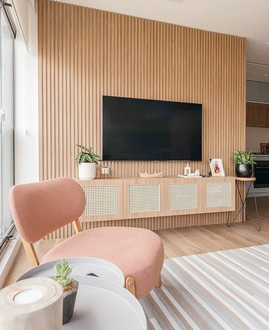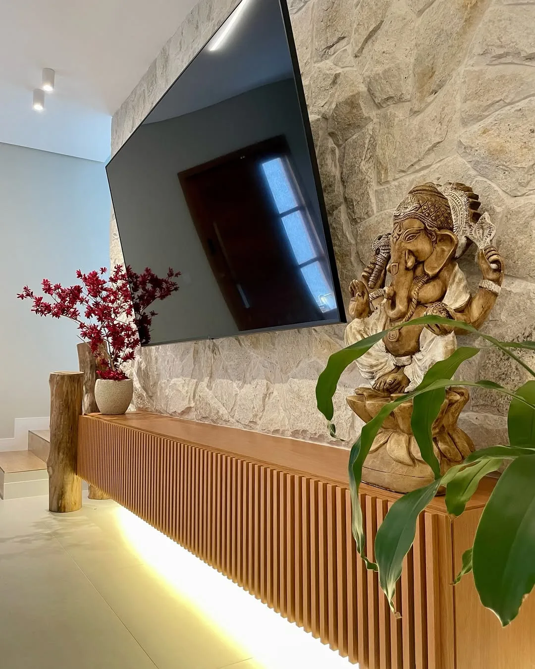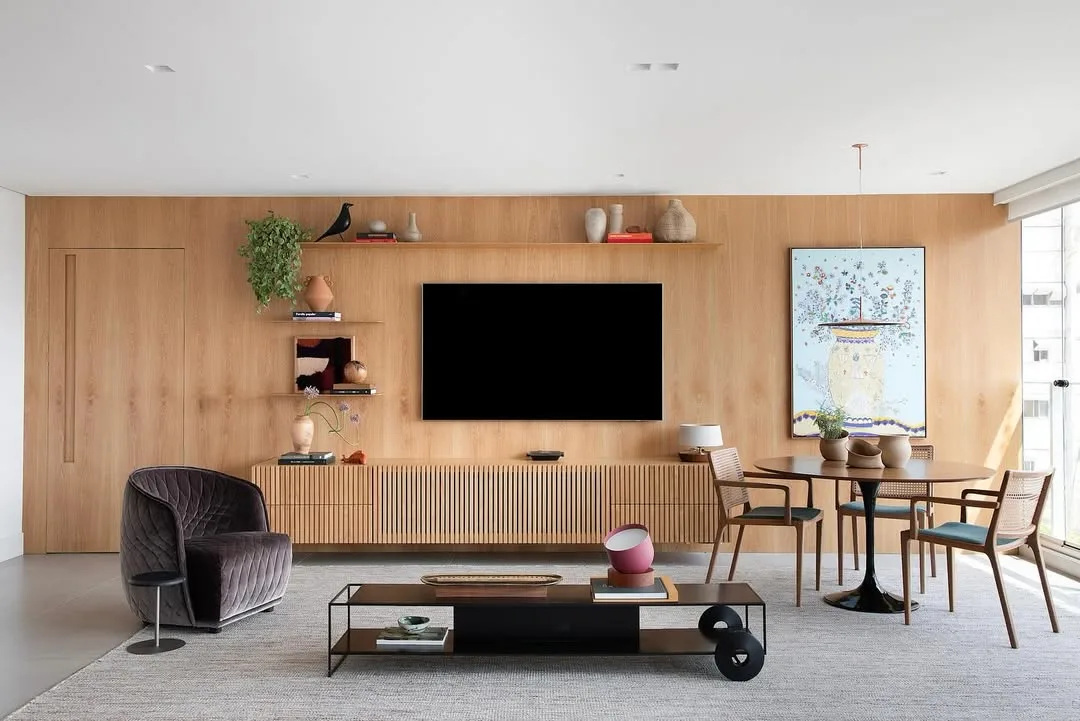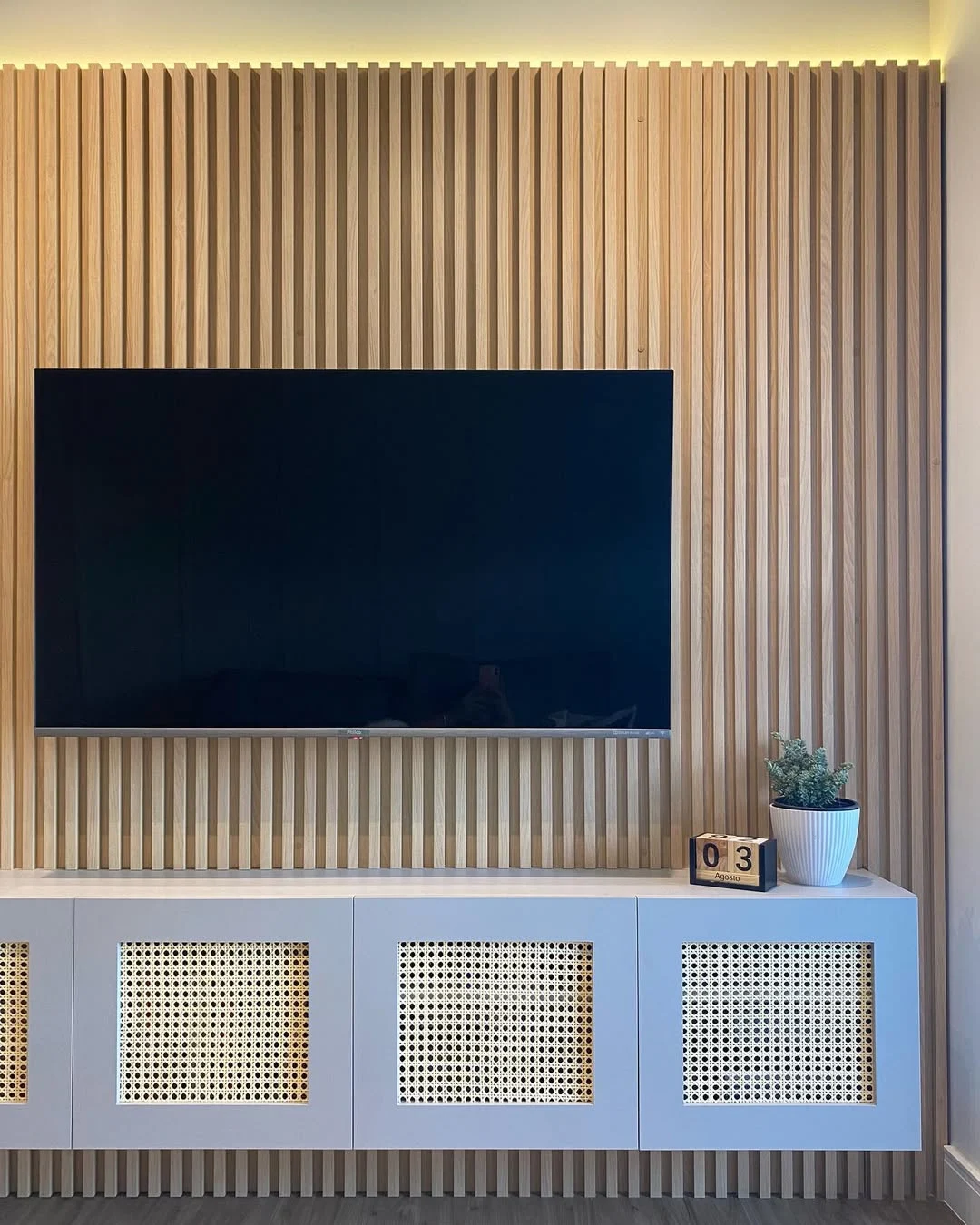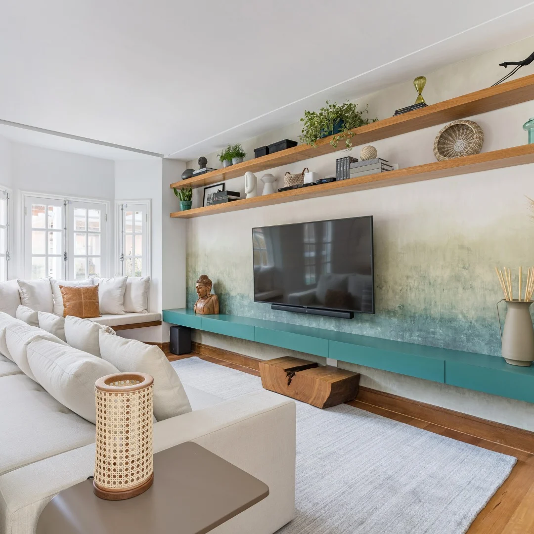 Em alguns modelos, o rack suspenso pode vir acompanhado por um painel de TV e ter compartimentos internos. Dá para optar por materiais como ripados para trazer mais textura ou, ainda, manter as superfícies lisas.