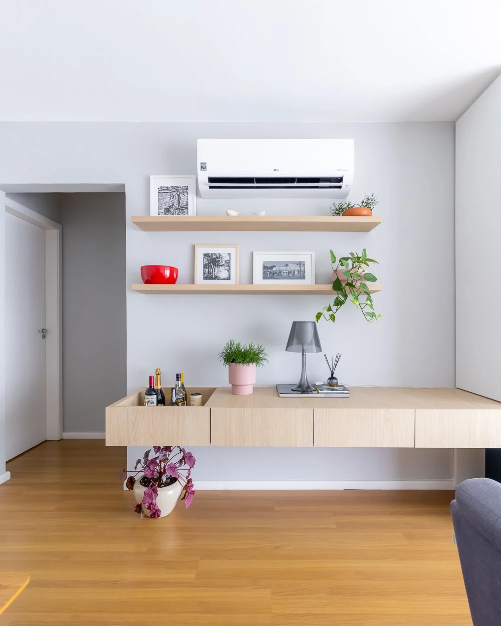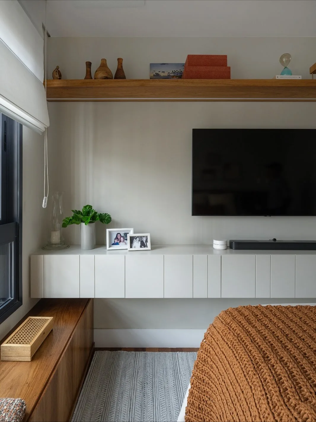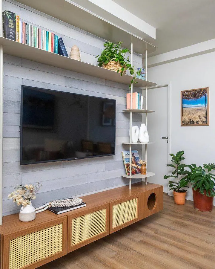 Se você tem uma sala pequena, essa é a solução perfeita! Como o chão fica livre, você pode acabar aproveitando para colocar outros objetos, como caixas organizadoras, puffs, baús e bancos.