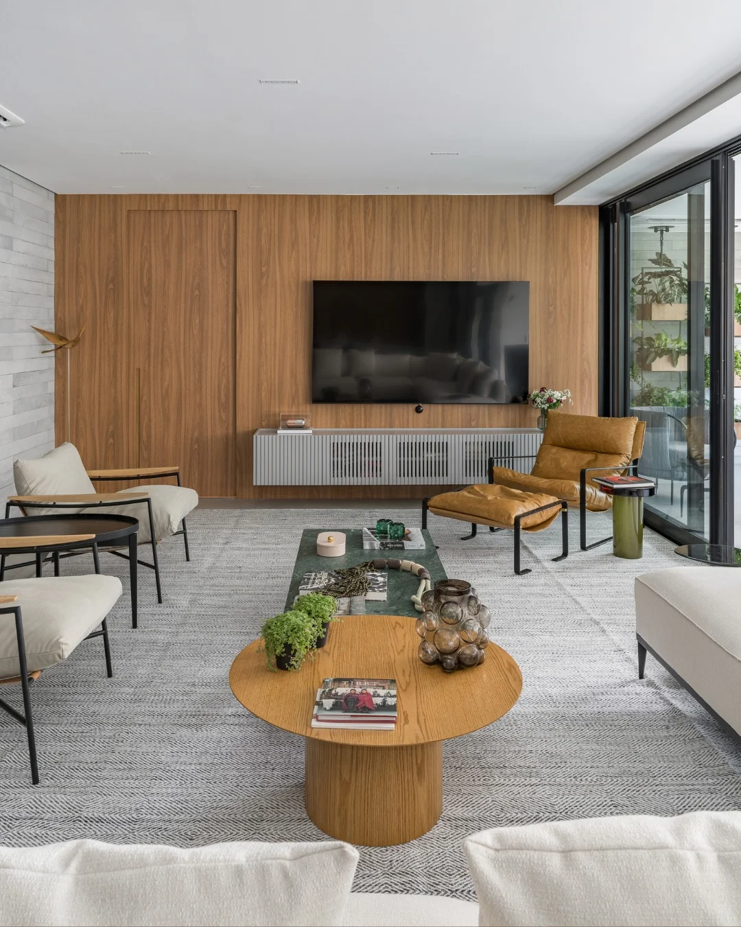 A ideia é manter tudo em um lugar só para deixar o visual do cômodo o mais harmônico possível. Além disso, como costuma ser um ambiente de relaxamento e descontração, é sempre bom que ele seja agradável visualmente.