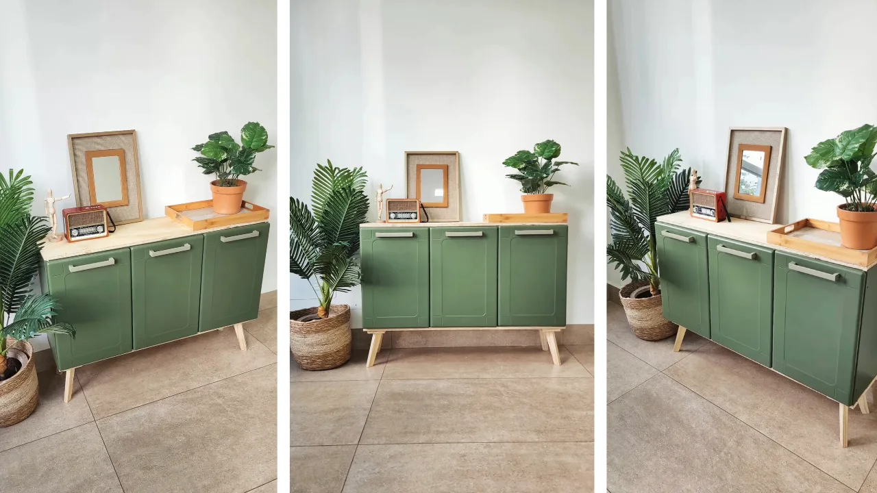 Então, vem ver como eu mudei o meu armário e conferir alguns truques bem legais!Armário de cozinha pintado de verde com tampo e pés de madeira, decoração em cima com vaso de planta e espelho.