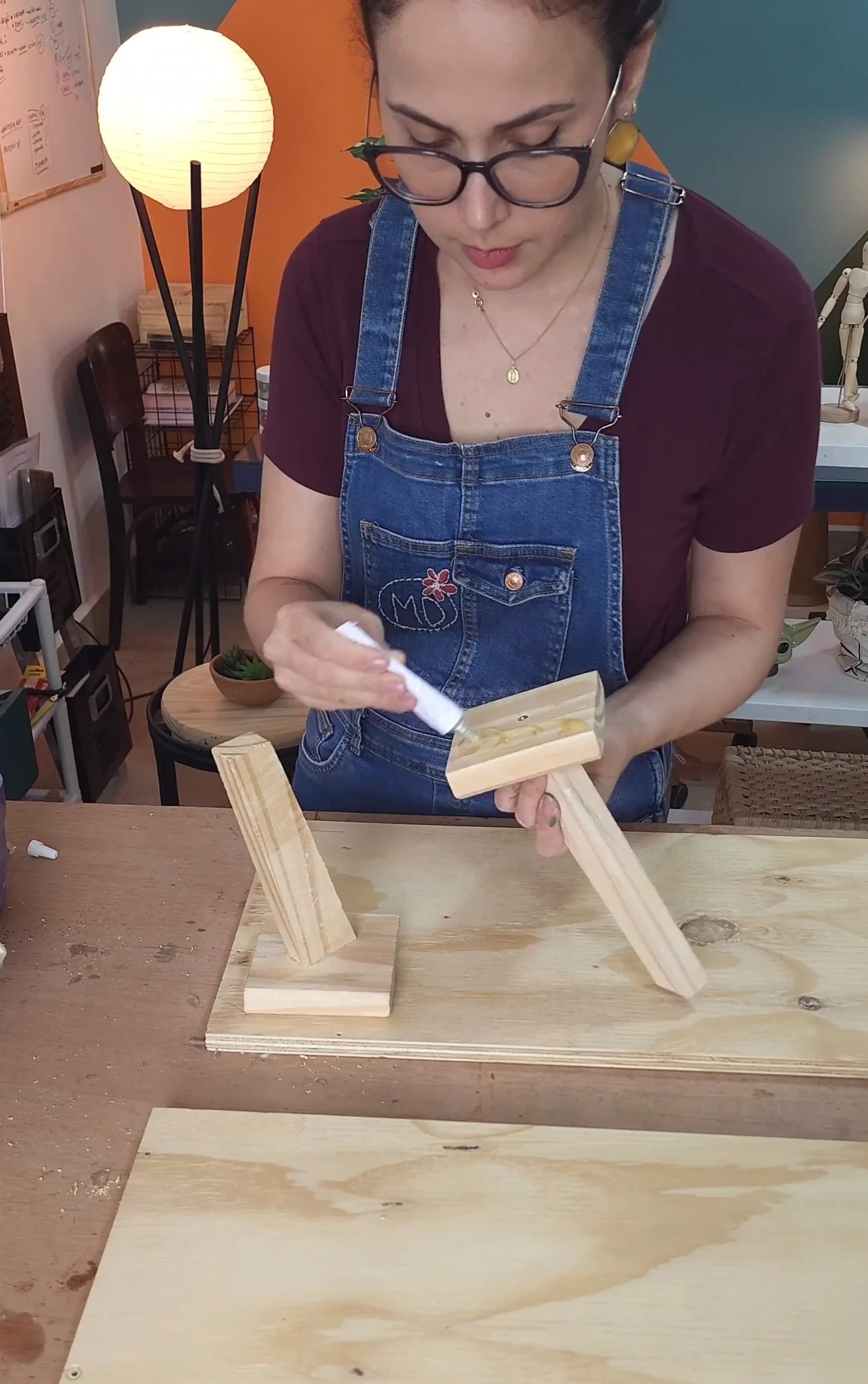 Em uma das tábuas, eu colei pés de madeira em todos os quatro cantos. Como eu queria que eles ficassem bem firmes, usei cola de contato para fazer essa primeira fixação. Depois, parafusei as peças para ficar bem preso e resistente.
